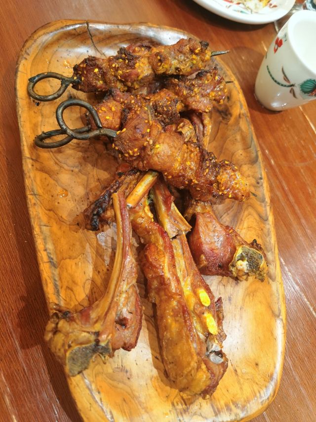 YANG ZHI WEI NANG KENG ROU到酒店以后,一边儿休整,一边搜附近美食,这家馕坑肉排行很靠前,于是就过来打卡了。 餐厅外面是小桌,里面还有包厢。菜单是纸质,直接自己勾选,我们选了几个评价比较好的。|乌苏啤酒^当地的特色啤酒给小伙伴儿点来尝了尝,只有四度,搭配烤串儿刚刚好。|卡瓦斯^卡瓦斯是当地的一种饮料,发酵制作,有一种怪怪的味道,没有喝出来是哪种水果,不过凉凉的还比较好喝。|菠菜面筋^这边吃的比较多的凉菜,红油凉拌,微微辣,菠菜量不多,想吃绿色菜的可以换其他的。|羊肉串^羊肉串是上来最快的,大块肉块,肉烤的比较嫩,吃着很过瘾。|馕坑肉^馕坑肉上来的慢,铁签位置比较烫,一定要注意。肉块比较紧实,口感比刚才的羊肉串要好吃。|烤羊脖^第一次吃,点的时候还有点小丢人,以为会是整个的[尴尬],被告知是切开的,于是只点了一斤尝尝味道。骨头周围挂着肉,肉少的熟的快,肥肉会变得焦焦的很好吃。肉厚的地方火候欠一点,不太好咬。|馕饼^饼的点法是按牙,本来想一人一牙,结果看到隔壁桌一牙是很大一块,于是只点了一牙尝尝。刚上来的有一点点硬,但是比较翠,吃着还有淡淡的甜,很好吃。 整体感觉:菜品很好吃,就是上菜有的慢,等了得有将近半小时,大家一定预留好就餐时间。