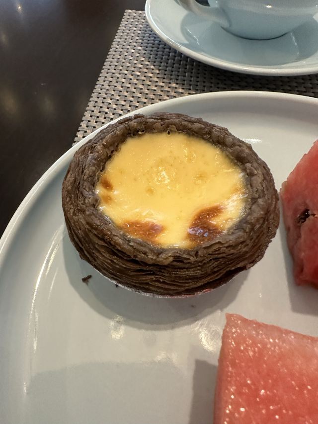 去海口出差,住在了威斯汀酒店,因为第二天一早就要离开酒店赶飞机,我应该是当天第二位客人来到餐厅,餐厅早早的就已经放满了食物,感觉食物的品种挺多的,而且出品也不错,味道挺好,当时因为没有客人,位置随便坐。吃了一晚当地的粉,还行吧,甜品其实挺吸引我的,但是还是有点担心太甜,终于选择了一个巧克力葡挞,正如想象中的挺甜的,但是好吃。