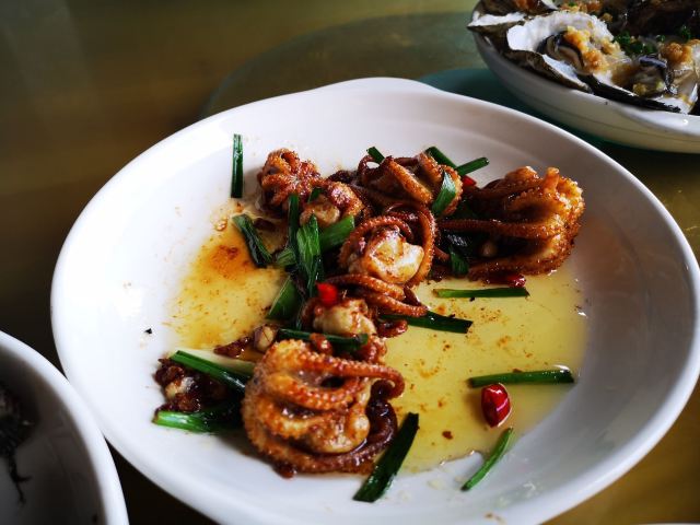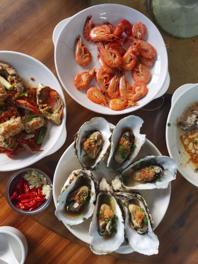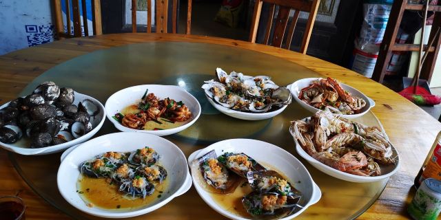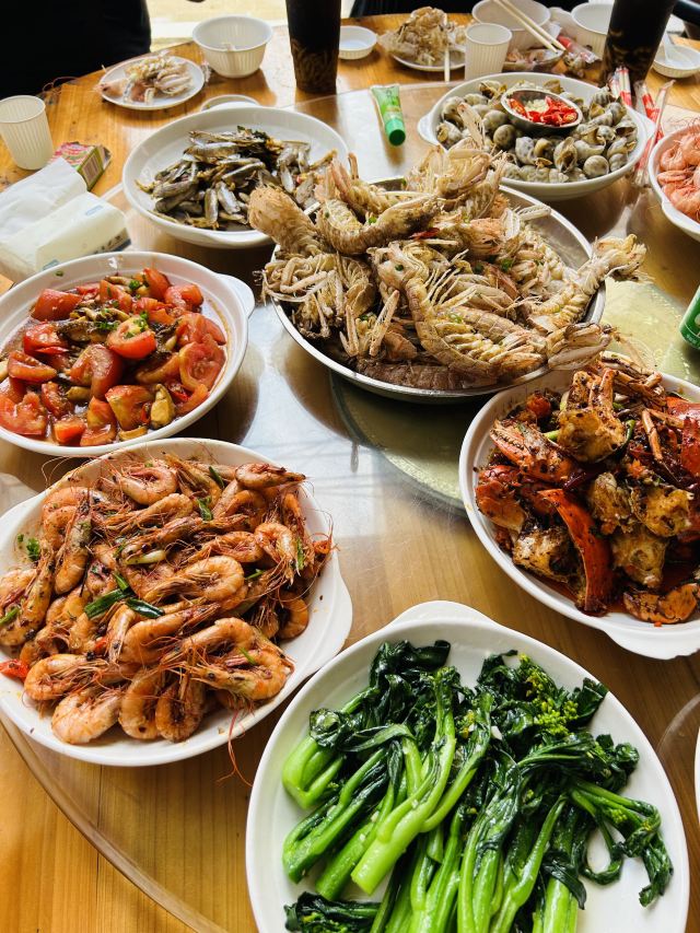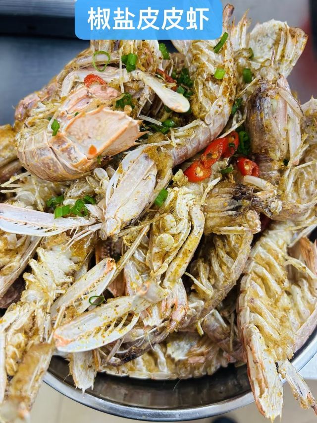 香煎鱿鱼筒,车螺芥菜汤,清蒸石斑鱼,椒盐濑尿虾,白灼虾,姜葱炒蟹,清蒸扇贝,牡蛎煎蛋,清蒸青螺,特色小龙虾,油爪鱼焗沙姜,杂鱼煲