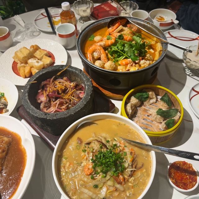 闽南葱头油肉汁焗荔浦芋头 芋头很绵软,咸鲜的酱汁,很香。福安石锅子姜丝炒黄牛肉 牛肉很嫩,和姜丝很搭。片仔廣蒸黄岐手工深海鳗鱼饺 当地特色,鱼饺,里面是鱼馅,很鲜。闽南沙茶海鲜锅 沙茶味道,当地特色,可以泡油条。莆田江口海鲜卤面 海鲜面 环境:还不错 服务:还可以