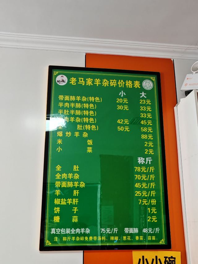 带面肺羊杂,全肉羊杂,饼子,水晶糖蒜,半肉半肺羊杂,八宝茶,半面肺半肚子,小菜,羊杂碎,白饼,全肚,老北京御香斋冰糖炖梨,果10水蜜桃,红山楂罐装,红荔枝罐装,鲜果橙,汉斯高橙,烩羊杂碎