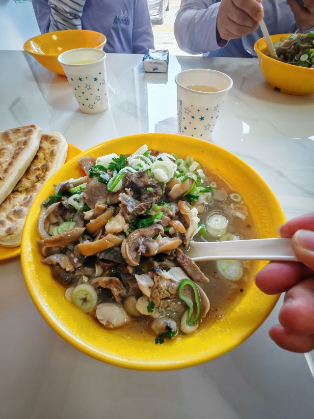宁夏的特色小吃羊杂碎,搜了这家人气度比较高的店铺,特意过来尝尝。店铺位于临街商铺,门口有一些停车位但是不多,建议不要开车来不好停车,停到马路上那是另当别论了。进门有个吧台点餐,特色餐是面肺子(面肺子是新疆维吾尔族传统小吃,以羊肺为主料灌入面浆炖煮而成,口感细腻和嫩),有羊杂混合,羊肉混合等。价格显示小贵,但是即使小碗肉量也很很足的。如果不吃辣可以和老板说,不说的话按照吃辣来出餐。店内打扫得很干净整洁,一层分内外套间,二层也可以坐人。上餐还是很快滴,羊杂口味浓厚没有膻味,三角小饼配着羊杂汤吃起来更舒服。西北人的口重,汤底略咸鲜。