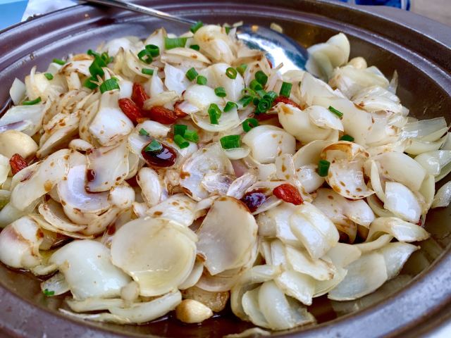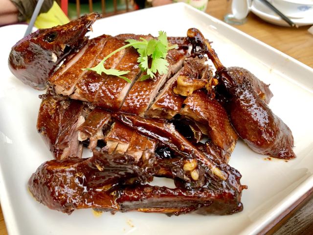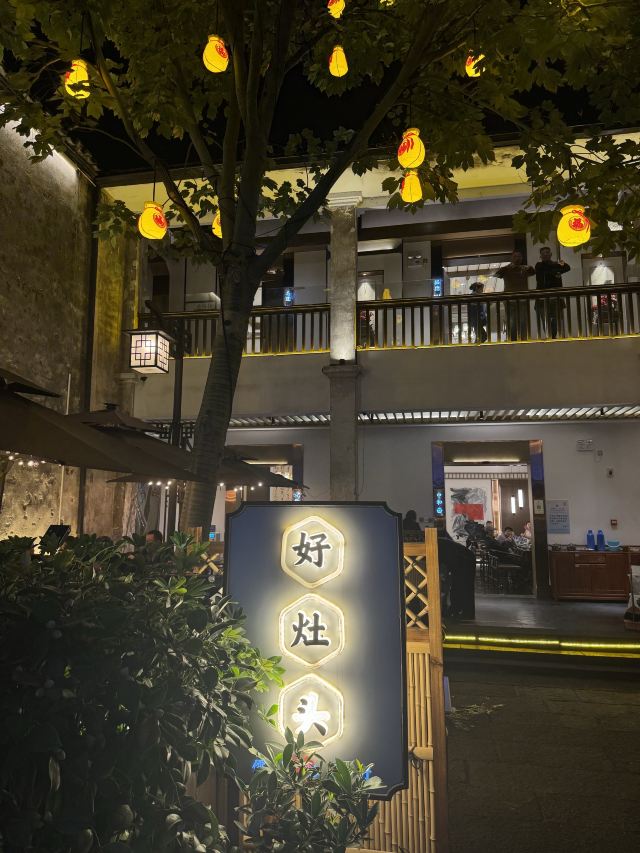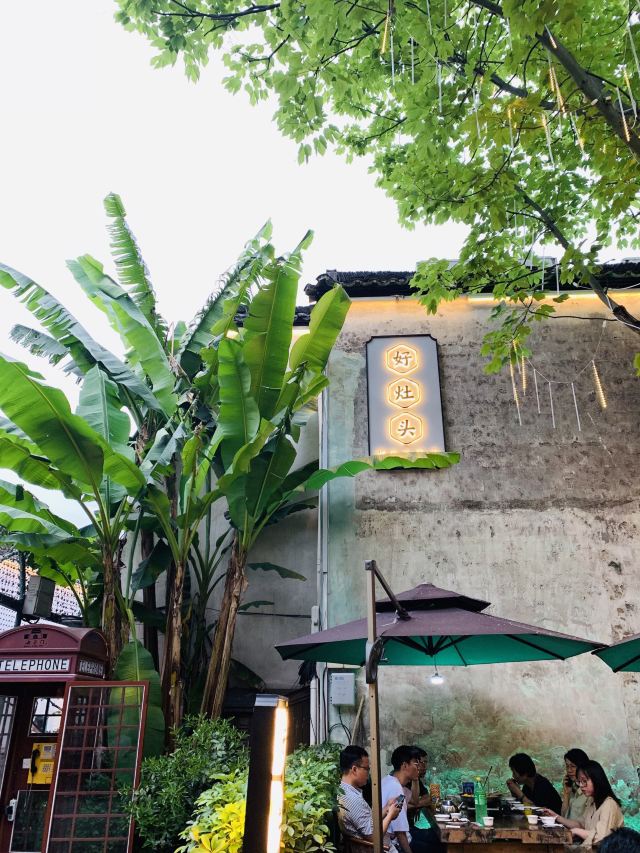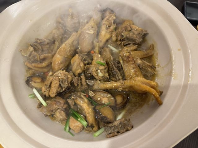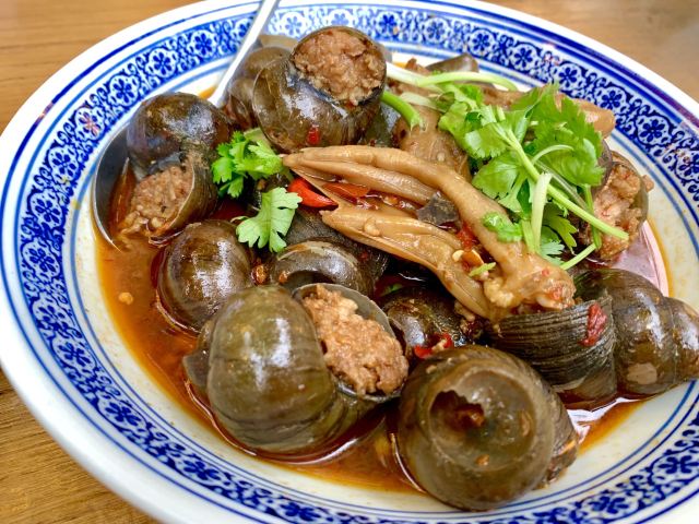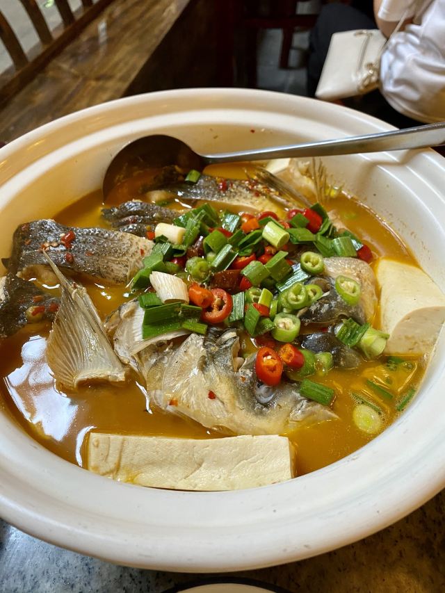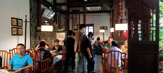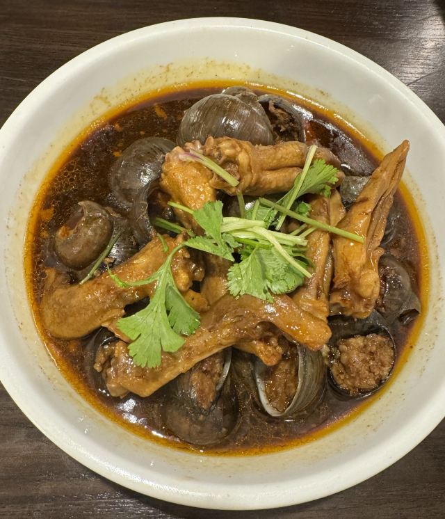 水亭街中排队比较多的一家饭店,饭点早早过来,还是排了半个多小时,被安排在了户外。这是一栋保护建筑,户外感觉是以前的庭院,只是现在被全敞开在街道上,有点夏天纳凉的感觉,不过还是有一点小热。点了当地名菜卤鸭头,很入味但是有点辣。店里的酱鸭,感觉是瘦瘦的板鸭,皮下一点也不肥腻,酱得很不错,咸香[强]特色的田螺塞肉是先煮好的,没有毛病就是感觉太辣,才上点缀两只鸭掌,多放点一起煮应该更好吃。担心上火,点了一份干锅百合,微微甜口感还不错,下面铺了满满一层洋葱爆香,有点油没敢吃。土鸡菌菇汤还是很鲜美的。实在感觉热,别家热门店点了一份薄荷水晶粉,真心搭配着吃不错[强]