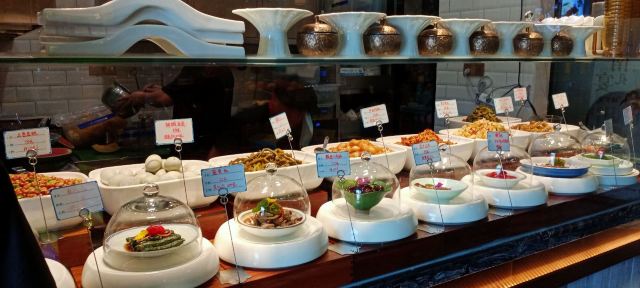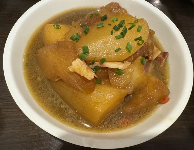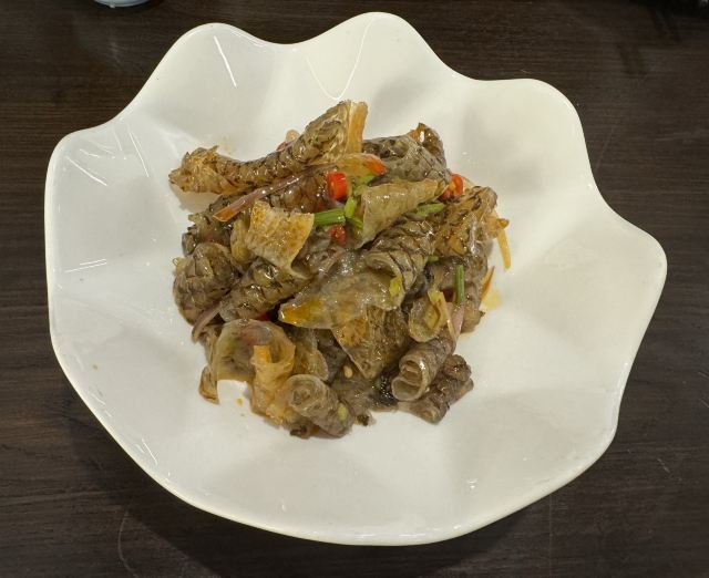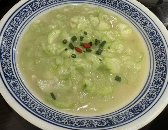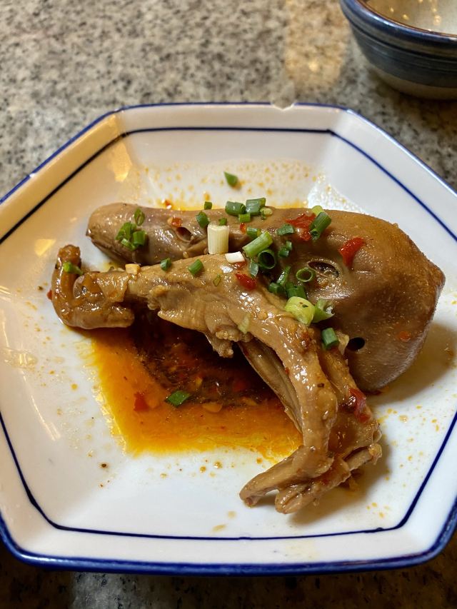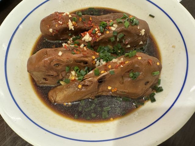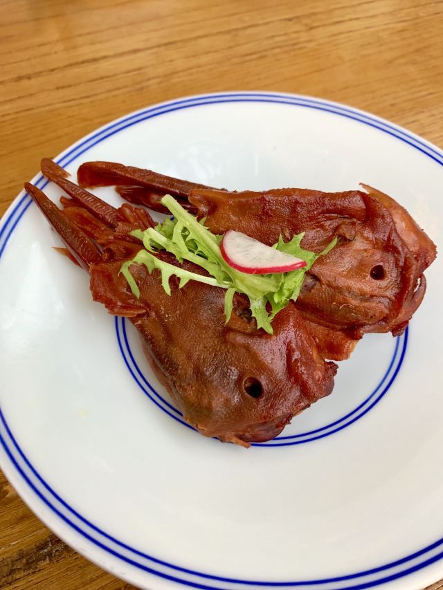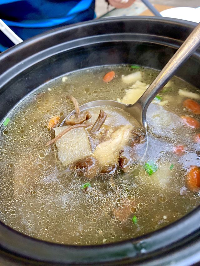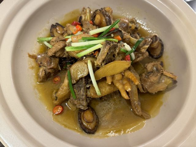 水亭街中排队比较多的一家饭店,饭点早早过来,还是排了半个多小时,被安排在了户外。这是一栋保护建筑,户外感觉是以前的庭院,只是现在被全敞开在街道上,有点夏天纳凉的感觉,不过还是有一点小热。点了当地名菜卤鸭头,很入味但是有点辣。店里的酱鸭,感觉是瘦瘦的板鸭,皮下一点也不肥腻,酱得很不错,咸香[强]特色的田螺塞肉是先煮好的,没有毛病就是感觉太辣,才上点缀两只鸭掌,多放点一起煮应该更好吃。担心上火,点了一份干锅百合,微微甜口感还不错,下面铺了满满一层洋葱爆香,有点油没敢吃。土鸡菌菇汤还是很鲜美的。实在感觉热,别家热门店点了一份薄荷水晶粉,真心搭配着吃不错[强]