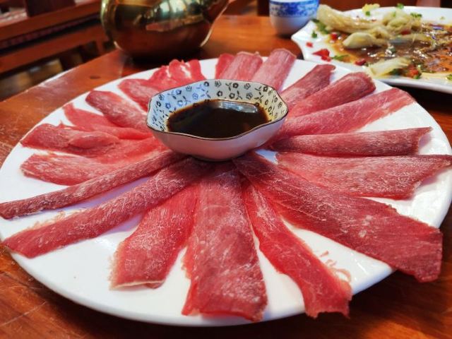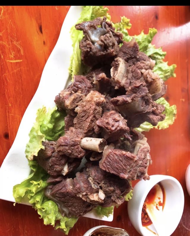 科尔尼蒙蒋琬在古城里按照导航找过去. 门店是在二楼但楼下有个店铺是锁住以为没有开门 ! 后来才知道是侧面上楼到二楼. 这家店之前极限挑战邓伦来过 .录过节目. 菜品不多. 点的都是他们这里最有特色的菜 【藏式牦牛肉火锅】好吃到不行 . 有蘸料. 底下有绿叶菜和土豆和花菜很统一吃饱 【牛肉披萨】牛肉披萨饼. 香香脆脆 吃两块就饱啦 【酥油烤蘑菇】蘑菇是用酥油来考的吃起来特别香 【手抓牛排】第一口的满足 真是无法形容了 肉质鲜。 直接脱离骨头 简直不要太美了。 【酥油茶】绝对是我这一行最好喝的了,是甜味的,真的一口香醇的。 【服务】藏族小哥哥特别好看 特别热情 ❤️ 值得推荐