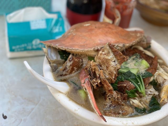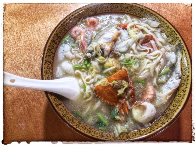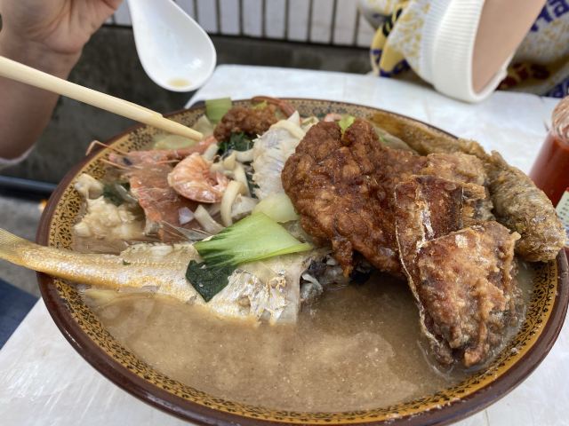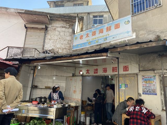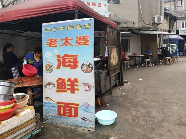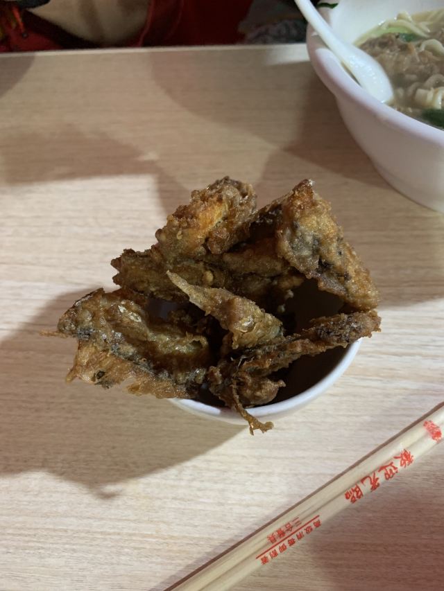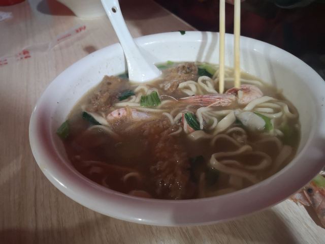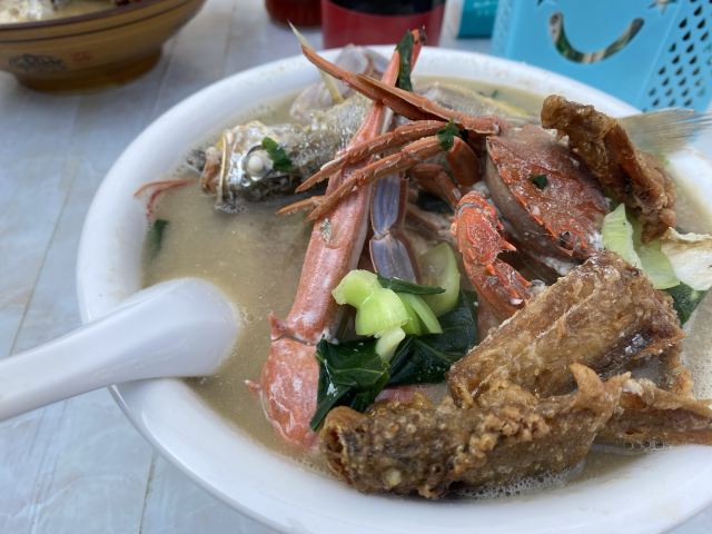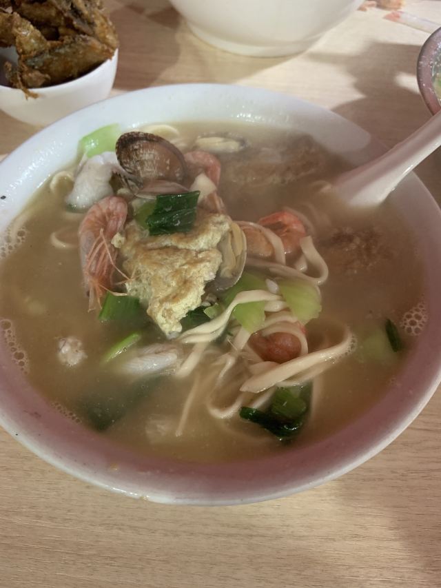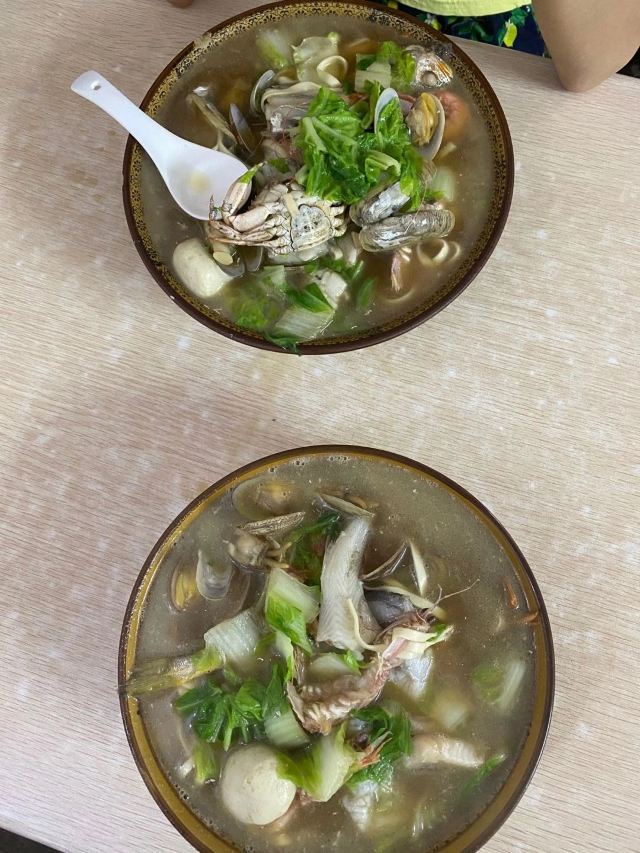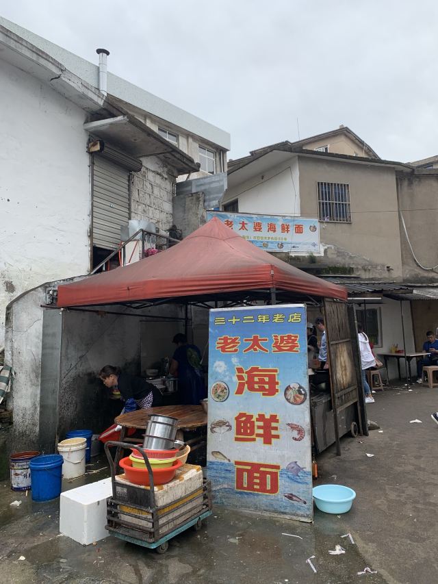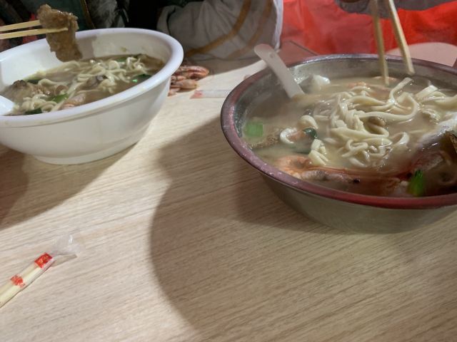 据说这家店是网红,也听到有的人过来说自己开了多少路前来吃的。 虽然不知道这家店是否是网红,但是生意的确十分的好,看地上桌上的垃圾就知道了。 面的话基本都是海鲜面,也没菜单,20一份,油炸小带鱼5块一份,很便宜。 不得不说,除去环境,这家店的口味很不错,海鲜很新鲜。汤的味道除了食材原本的味道,没有其他的。而且20一份,性价比也算很OK