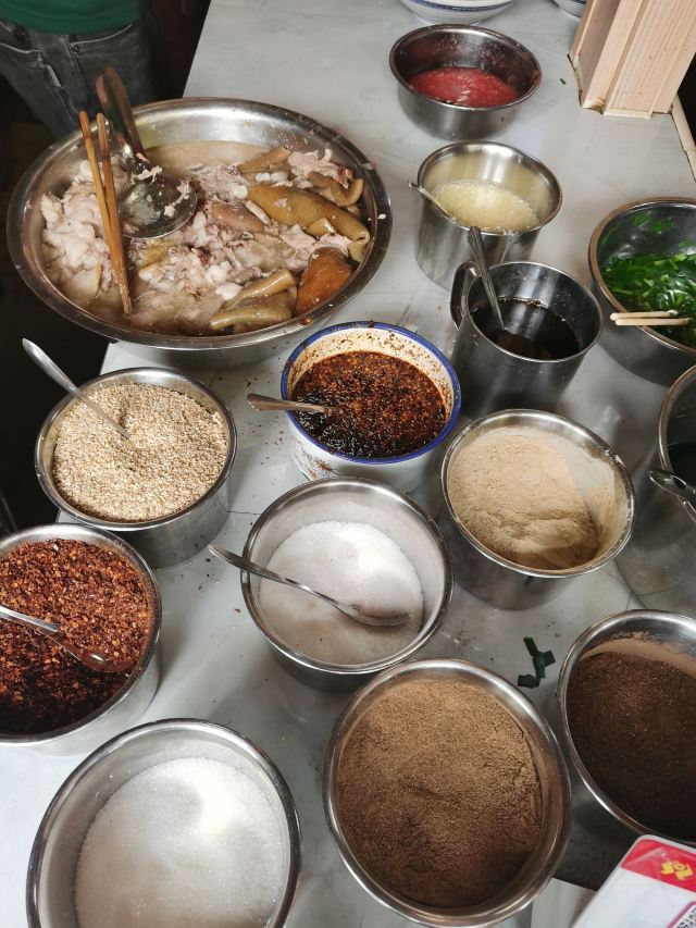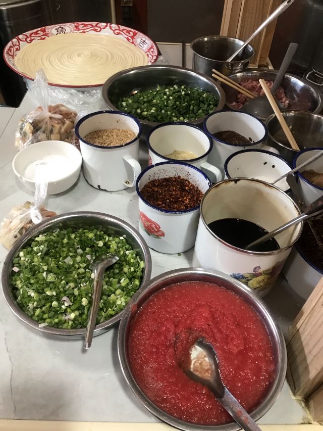 干拌面,卤饺,卤笋,杂酱肉冒,番茄作料,作料,一根面汤面,小份粑肉饵丝,奖牌,煮面锅