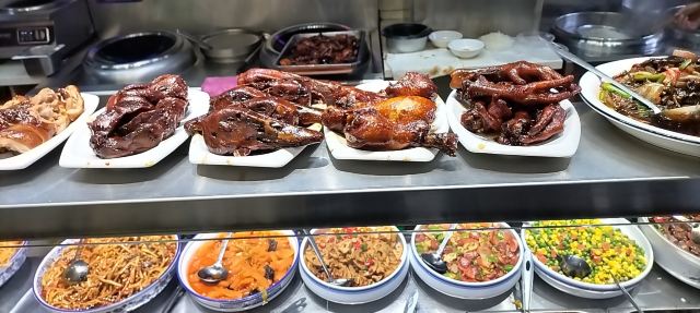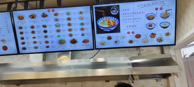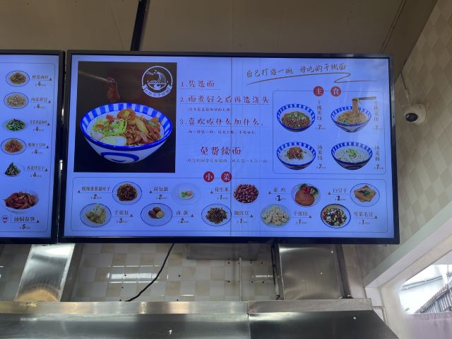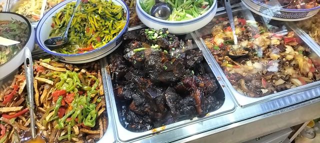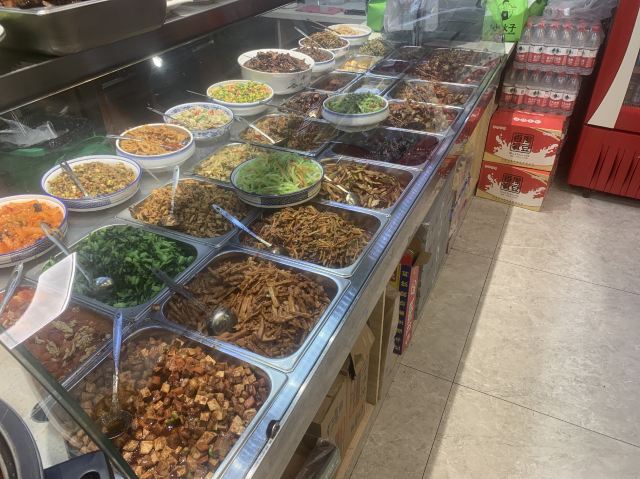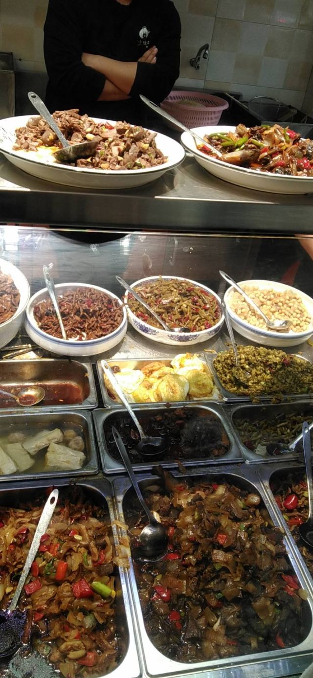 肉圆,干挑面,红烧排骨,油焖春笋,套肠,虾皮紫菜汤,豆腐干,土豆丝,猪肝,西红柿炒蛋,雪菜,卤鸡爪