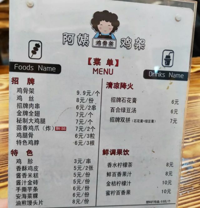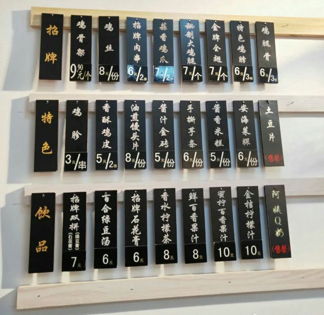 蒜香鸡爪,特色鸡脖,鸡胗,酱汁金砖,全翅,馒头片,盐焗鹌鹑,鸡腿骨,咖喱豆皮,阿姨鸡架,招牌肉串,炸鸡皮,鸡丝,手撕芋条,石花膏
