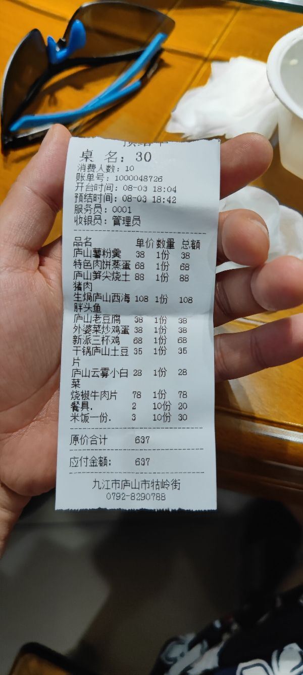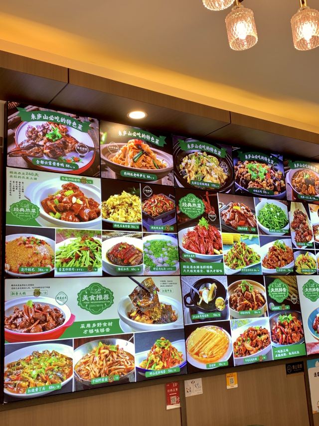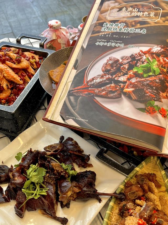 生焗有机胖头鱼,庐山笋尖烧土猪肉,庐山红烧石鸡,庐山小土豆烧肉,庐山松茸菌菇汤,庐山三杯石鸡,野芹菜炒肉丝,庐山笋衣烧肉,石鱼炒蛋,庐山老豆腐,辣椒空心菜,庐山野芹菜