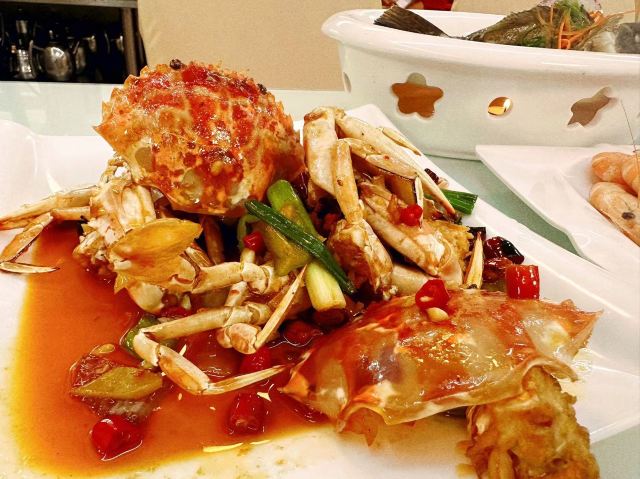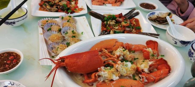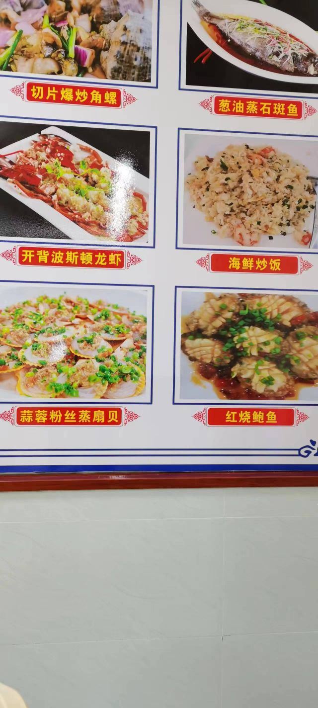 清蒸石斑鱼(鲜活),招牌香辣蟹,蒜蓉粉丝蒸扇贝(鲜活),蛤蜊炖蛋(鲜活),白灼基围虾(鲜活),鲍鱼