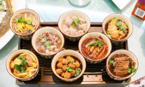 八大碗延用当地传统寿筵、婚筵形式,可分为农家风情荤素筵、佛国特色素斋宴。具体可分为“五盔四盘”“八八六六”筵席等。所有菜肴均采用手工粗瓷大碗(盘)盛放,可八碗成席,亦可拆分成席。