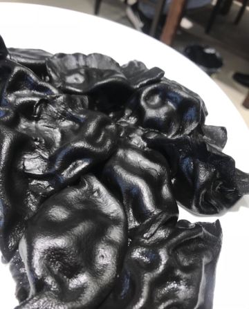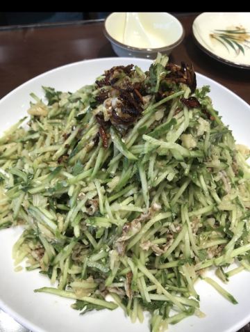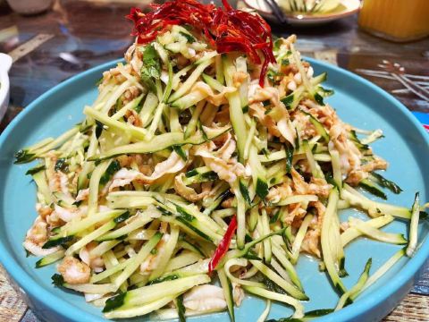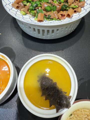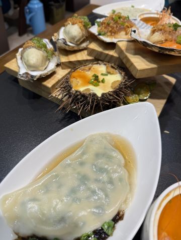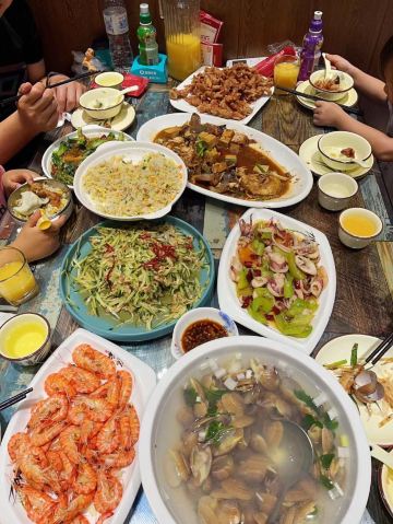 红烧小鲍鱼,辣根鸟贝,炒花蛤,酱炒小黄瓜,三鲜焖子,蒸海蟹每只,蒸海胆,大鲅鱼水饺,炒蛏子,炸小虾,海螺丝,红烧肉,三鲜饺子,海鲜疙瘩汤,辣炒飞蛤,小豆腐,韭香海肠,辣炒八带,杭椒牛柳,大葱蘸酱,辣椒炒肉,炒肥蛤,炒豆芽,炸知了猴,虾煲,红烧肉