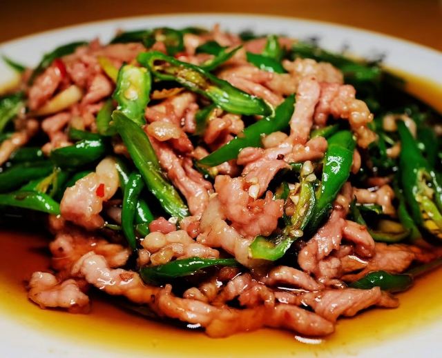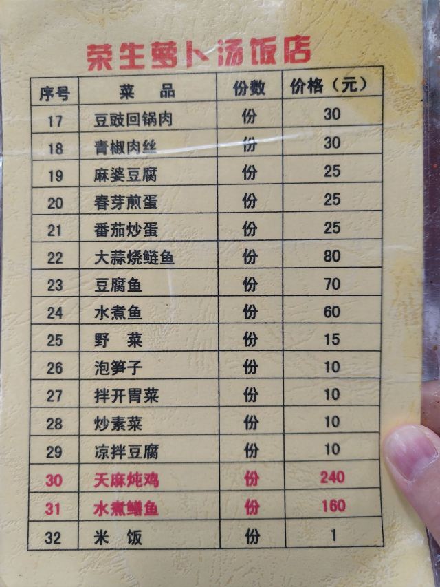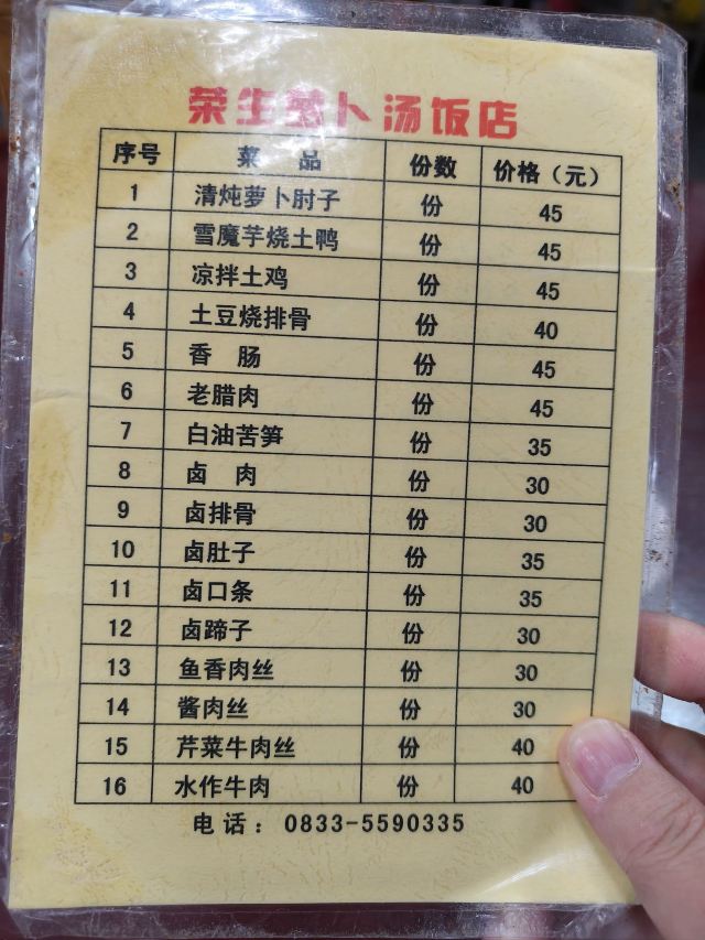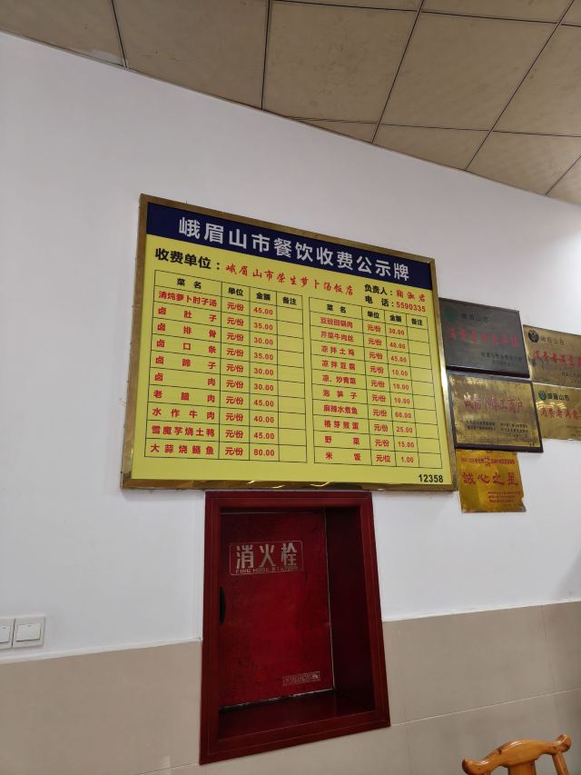 峨眉山必吃榜入围餐馆,以前吃过另一家类似的,觉得也还行,就一直没来吃这家。过年前的峨眉山还不算热闹,想着应该不会排队就前来试试。门口的坝子有人指挥很好停车,店堂虽然装修普通,胜在面积非常大,还有点气势。菜的种类也就31个,选择不多。招牌的清炖萝卜肘子来了一份,肉没有腥味,肥肉占了一大半,普通家常而已。45元一份,人少来吃不完,起码有四个人才应该点这个菜。青椒肉丝30元一份,火候刚好,炒得很香很下饭,推荐推荐。