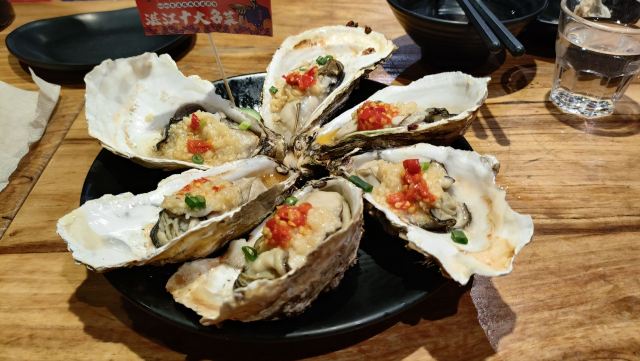 来湛江 不吃生蚝怎么行? 于是乎 记忆里 从下榻的那刻起 每一餐都离不开生蚝 今天打卡的这家可有来头 上过央视 可了不得 店铺刚好就在酒店楼下 名字叫做|烧蠔帮·湛江生蚝(金沙湾店)^ 豪气的排场800米开外就看到了 因为过了饭点 等位的人不算多 听闻饭点的时候来 可是要等好一会儿的 他家生蚝是主打 各种做法 不过我对生蚝没有执念 感觉也就是那个味道 倒是烧烤 很配这个季节 再来杯快乐水 哇咔咔 Nice