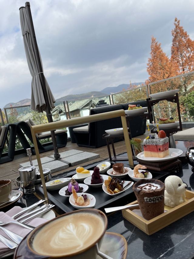 位于丽江和府洲际度假酒店的下午茶餐厅,装修非常上档次,有室内和室外的座位可以选择,现磨咖啡口感醇厚,其他的出品也非常赞,抹茶红豆冻芝士、雪山玫瑰金、覆盆子芝士蛋糕都不错,性价比也超高。透过落地大玻璃窗,还能远眺玉龙雪山。
