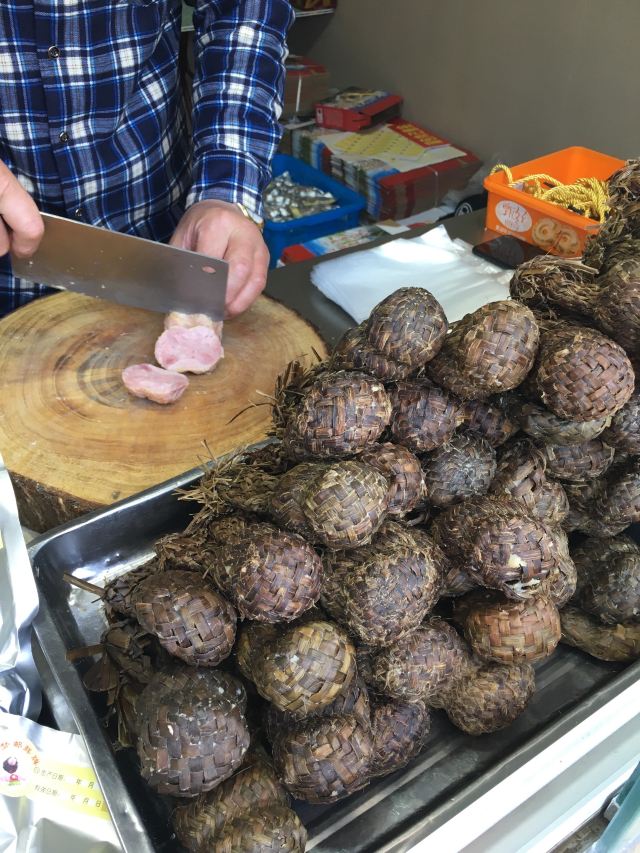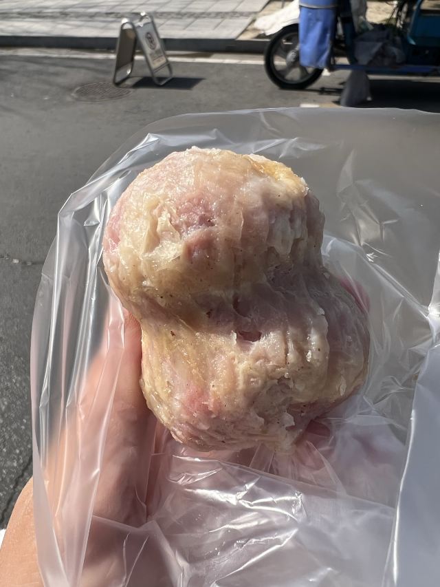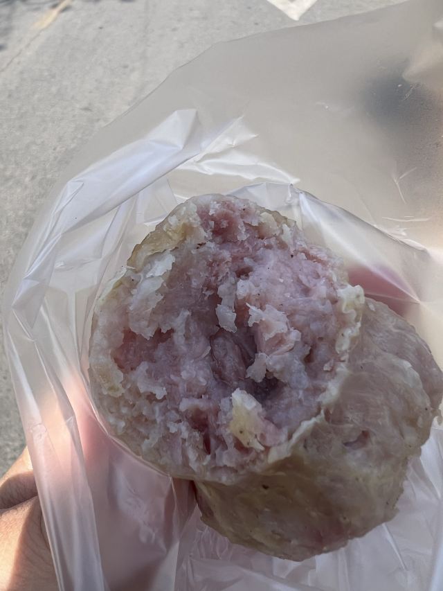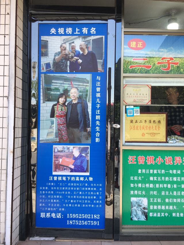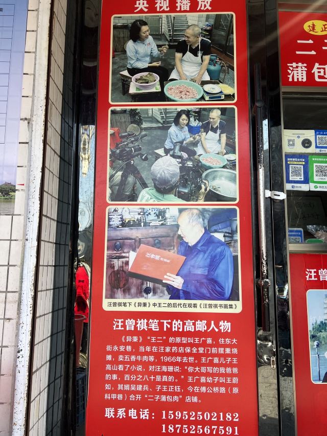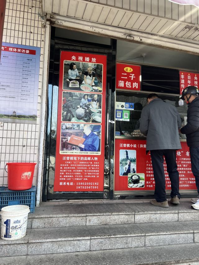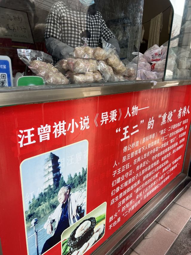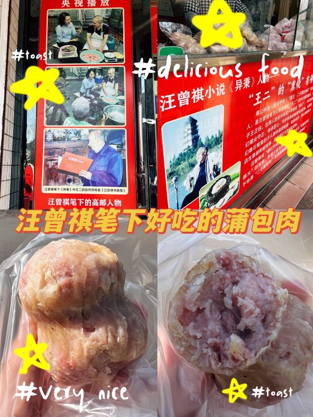 汪曾祺笔下的蒲包肉原型,在小说《异秉》中他写道:蒲包肉似乎是这个县里特有的,用一个三寸来长,直径寸半的蒲包,里面衬上豆腐皮,塞满了加了粉子的碎肉,封了口,拦腰用一道麻绳系紧,呈一个葫芦形,煮熟以后倒出来,也是一个带有蒲包印记的葫芦,切成片,很香。 现在5块一个,老板会帮忙切片配牙签供品尝。口感还不错。