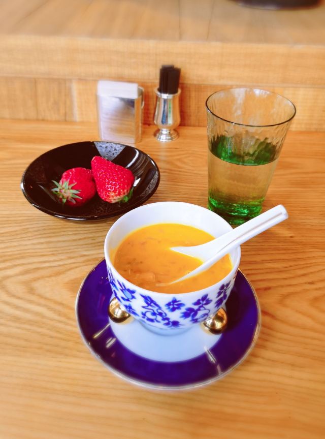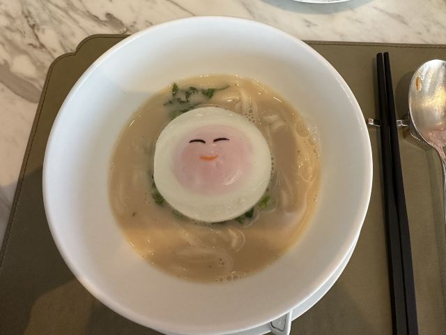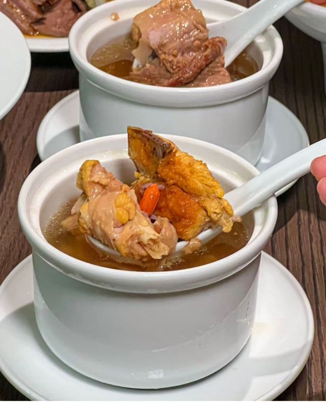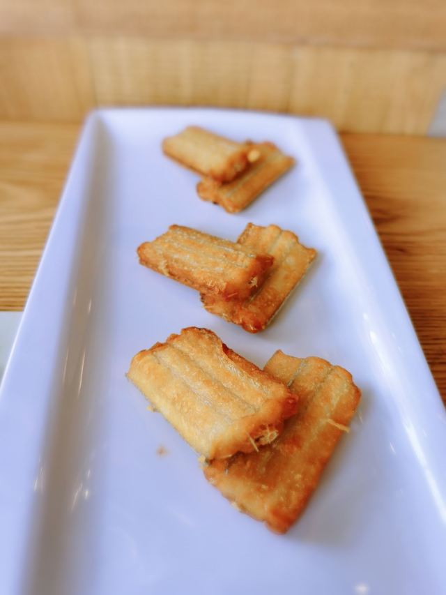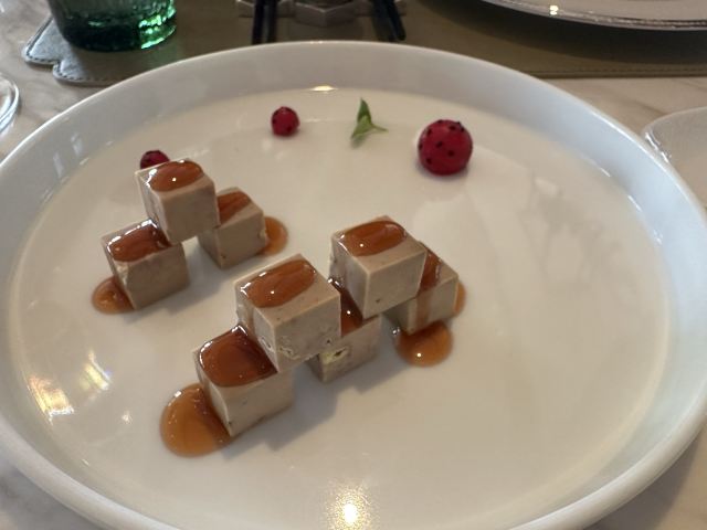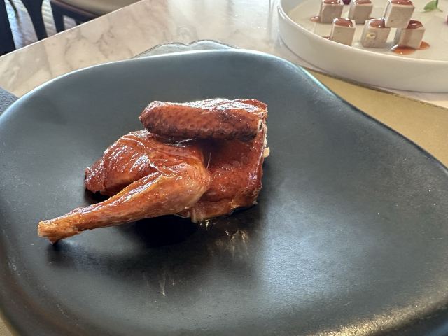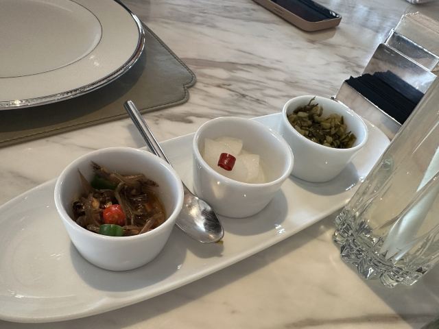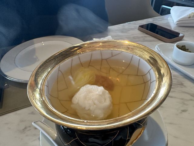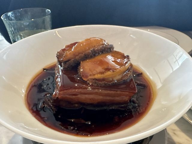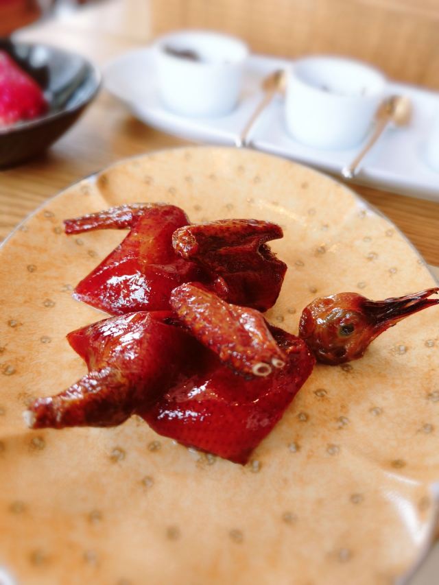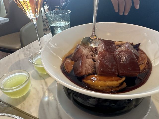 用脚下的路丈量这个世界首先说环境,在香格里拉酒店一层的一侧,里面别有洞天,空间很大,有适合一个人的吧台位置,还有各种规格的大厅餐位,更有长廊深处的幽静包间,满足各种聚会需要。 其次是服务,不得不说,#米其林三星的水准,不只是菜品口味,更是深入每位员工内心真诚的服务态度,不是点头哈腰那种无处不在的吓人,更不是高冷范,而是很亲切的,想你所需的那种润物细无声的代入感。 最后说下菜品,因为是苏浙菜,自然是海鲜和山珍才符合三星的气质,但高端中也未忘记平民化。一个人点不了大菜,也就可以来试试这里的小点。和牛蛋挞是一个创新,浓郁芝士搭配酥脆的千层蛋挞皮,裹着里面带有丝丝芥末的和牛粒,只一点点似有似无的芥末,却是融合的恰到好处。乳鸽和叉烧包,可以用同一个词形容,那就是外酥里嫩,尤其叉烧,酥的掉渣,特别的入口。应季的四月青团,本以为是传统蛋黄,却是意外的香菇笋丁馅,这还是第一次吃,也很特别。