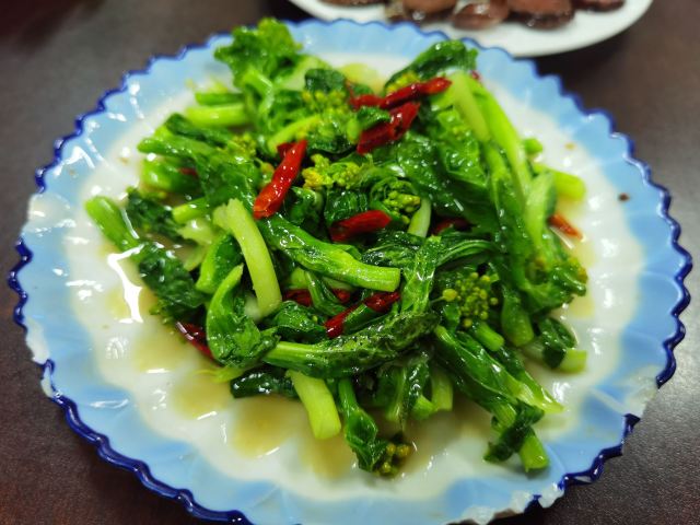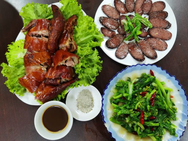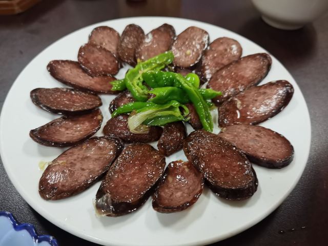 《晓世界》国内环游篇📍云南 感觉这里更适合人多一点吃饭,毕竟面积大,菜量也多,特别是招牌的手抓饭,虽然很想尝尝,但是份量实在hold不住哦。 不过店家态度很热情,又给推荐了其他几个特色菜。 |烤鸭^跟常吃的北京烤鸭不太一样,应该不是一种做法,皮没有酥脆油香了,不过冷吃起来味道倒也不错,还比较入味。 |豆腐肠^店家说是本地特色,类似血肠但是加了豆腐,略有点吃不惯。 |炒油菜尖^说是这么嫩的菜尖不是经常能买到,正巧白天菜场遇到了,简直太好吃了,我可以一人吃掉一大份。 福贡相对怒江沿线其他几个游客常落脚的乡镇来说,有点小且发展没那么快,穿城而过的路不宽,停车更是大问题。这家自己有个大院子,停车就方便多了。