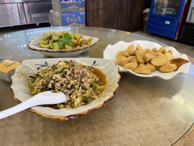 看着网上评价很不错,傍晚的时候就过去吃了。也不知道怎么点菜好,干脆就要了一个套餐,才78块钱。量很大,完全吃撑了。汽锅鸡和豆腐都是当地特色,但我觉得最出彩的是酸菜肉沫。酸度刚刚好,还有一点点甜,非常的美味。