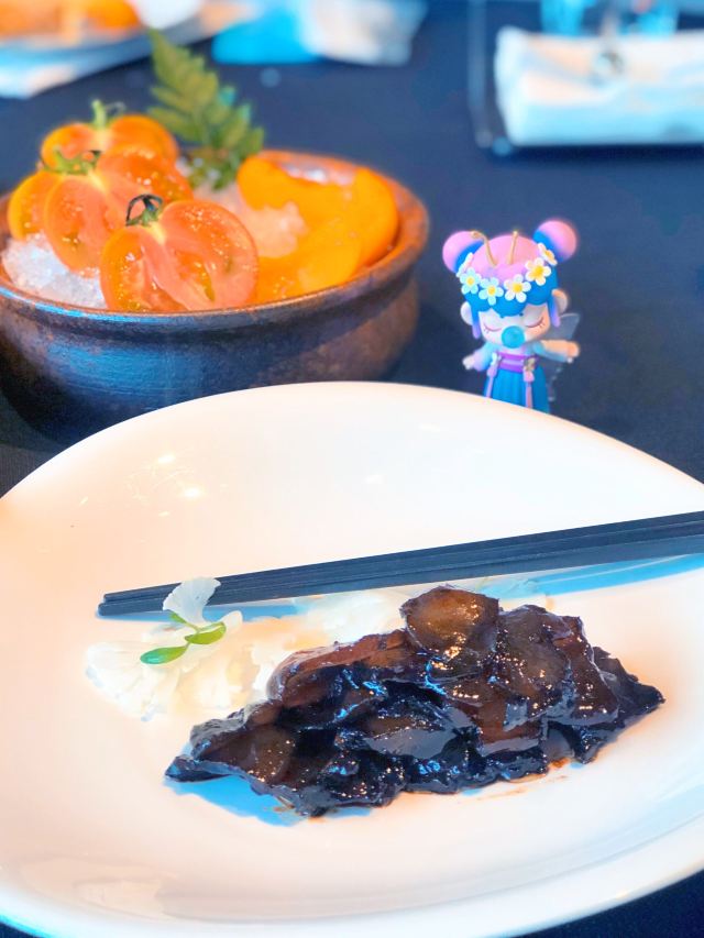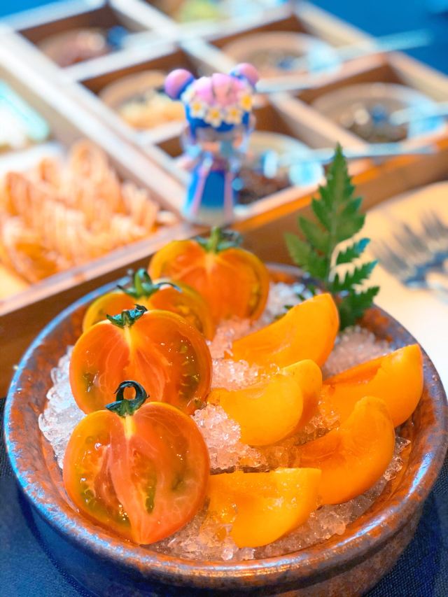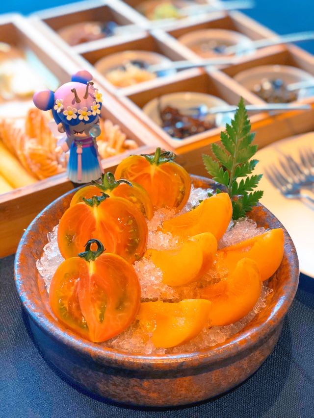服务超棒,尽管当天客人比较多,店员们都很忙碌,但服务丝毫不怠慢。尤其是店长,也太兢兢业业了! 精美果盘 果盘里是红宝石西红柿和崂山红杏,妈妈说吃出了小时候的感觉,那种纯天然无污染无农药的小美好。