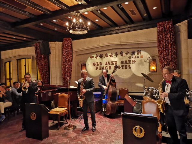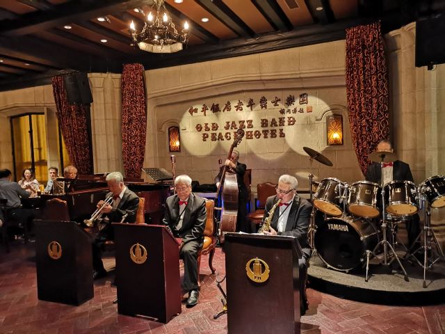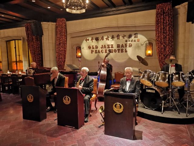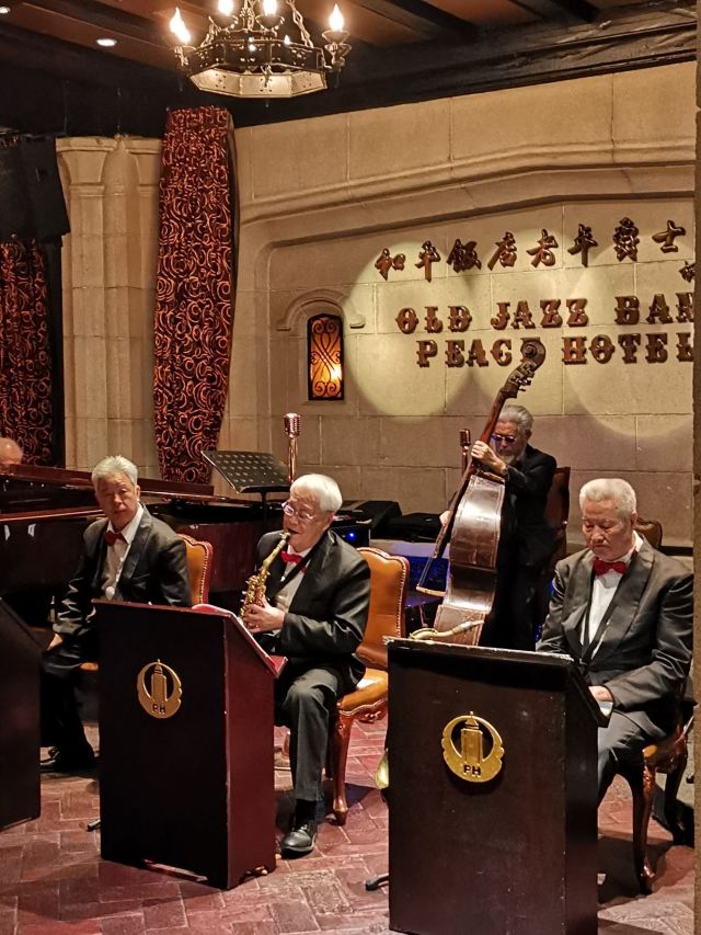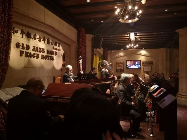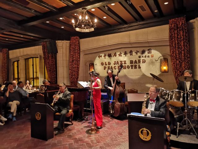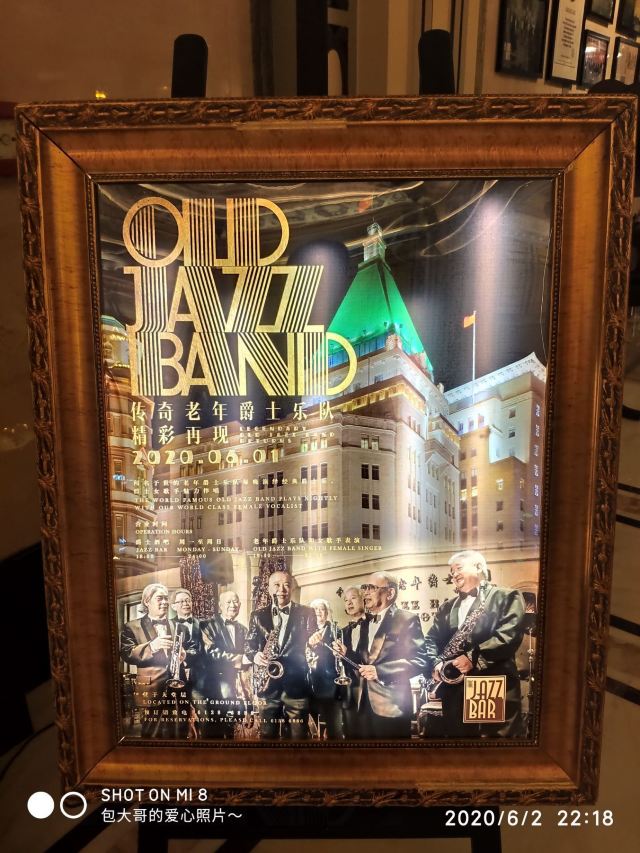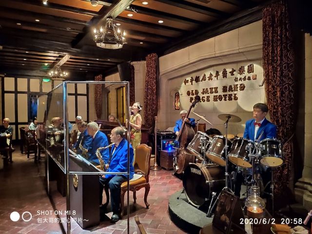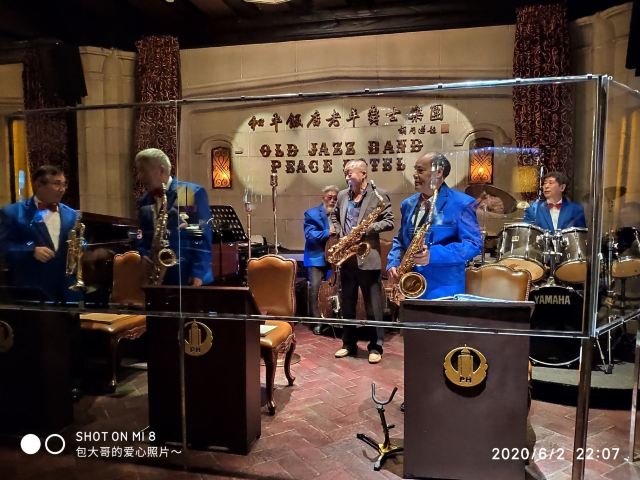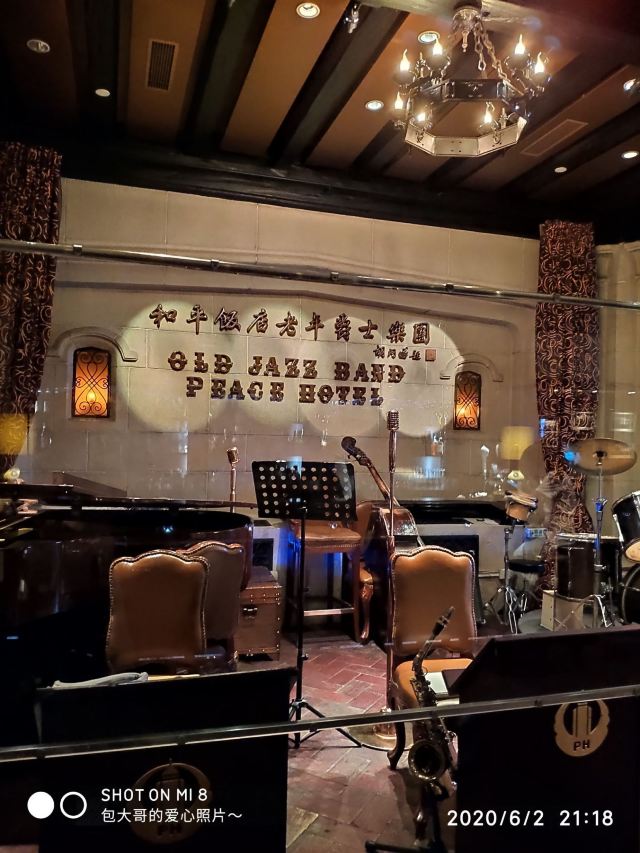 包大哥2020-06 包大哥上海和平饭店3D2N怀旧爵士之旅 和平饭店的《老年爵士乐队》 一直是夜上海的传奇 和平饭店的一大亮点。来上海不能不到外滩 到外滩就一定要来《爵士酒吧》坐坐。 爵士吧就在一楼大堂斜对过 和用早餐的茉莉餐厅是同一个入口;门口从晚上6点就有穿着上世纪30年代暗金色旗袍年轻貌美高挑的的美女领位在前台 带领客人入场就坐。穿过极具有历史感的全木质座椅 昏黄灯色 斑驳的大提琴 衬托出爵士乐队的悠久历史;歌手的着装和演唱的歌曲 也都是老上海金曲;让人恍然瞬间跌回到三零年代纸醉金迷的时光里! 当晚从507号房下电梯转观光电梯到华懋阁晚餐;就在楼下电梯厅遇到一位着西装非常客气的酒店人员向我们住店客介绍爵士吧的开业活动。住店期间二晚的爵士吧活动 都是请他帮我们安排座位点单。爵士吧才开业 工作人员都忙得不可开交 但是他还是发挥上海老派男人的绅士精神 帮我们上上下下打点安排座位 让我们度过了二个愉快的上海之夜。后来方得知 他是爵士吧的Johnnie孙经理。 在华懋阁用餐的空暇时段 餐厅主管ZOE热情地操着和林志玲一样软软嗲嗲的台湾腔 兴奋地向我们介绍1楼爵士吧才重新开幕的讯息;要我们不要错过这个极富夜上海 专属和平饭店的特色节目。而在用餐后 还有餐厅主管Fancy 热心地带我们从9楼华懋阁到1楼的爵士吧;在等候电梯期间 她也特别介绍了当天爵士吧的特色开业宣传活动。 歌手主要是演唱邓丽君等早期红星脍炙人口的歌曲 在现场爵士乐队的用心演奏之下 现场气氛真的是好极了。首首动听的怀旧老歌和多层次的乐声相伴 真是将灯红酒绿纸醉金迷的夜上海迷人气氛绽放到极限。中间还穿插有肖先生的萨克斯风独奏 他仿佛用生命来吹奏 吹到激昂的时刻 脖子上的青筋从脖子上爬到他的板寸头。他时而眼神暗示鼓手节奏 时而低声和他的伙伴协调 他的夜来香吹奏的极好!太棒了~ 疫情期间 连爵士吧的工作人员全程都戴着口罩;乐队成员都是老人家 更是珍贵如熊猫般的国宝;演出台前 也安置了全透明的防护罩。这点和平饭店做的非常到位 也很赞! 因为是饭店的住客 所以定位和入场消费都很方便 没有特别的要求,一通电话给前台或是和餐厅任何一位工作人员定位 他们都很乐意也很快速的安排妥当 完全不用担心会有遗漏的情况发生!这点很赞! 来和平饭店住 吃美食+赏美景+爵士吧 真是一大享受!下次一定再来重逢!
