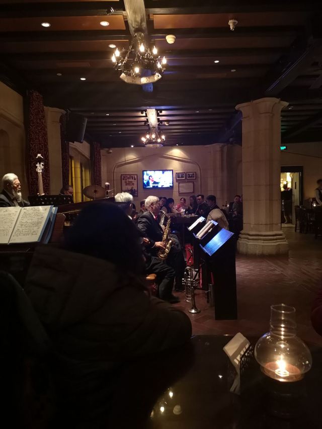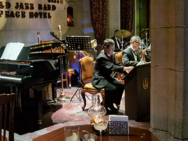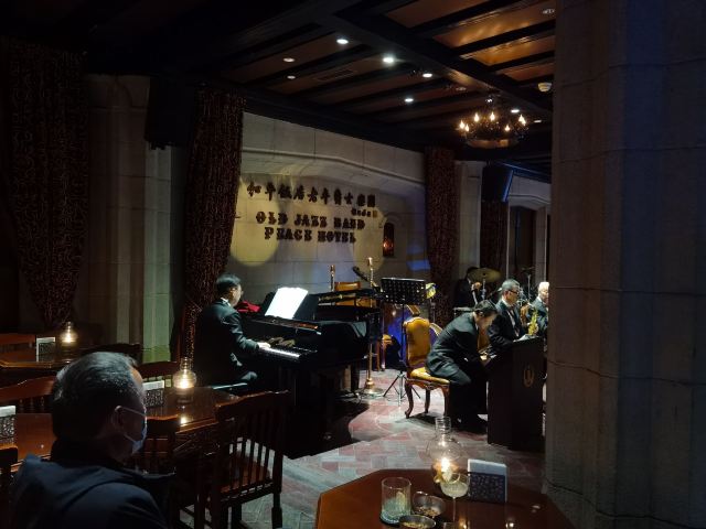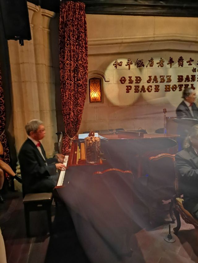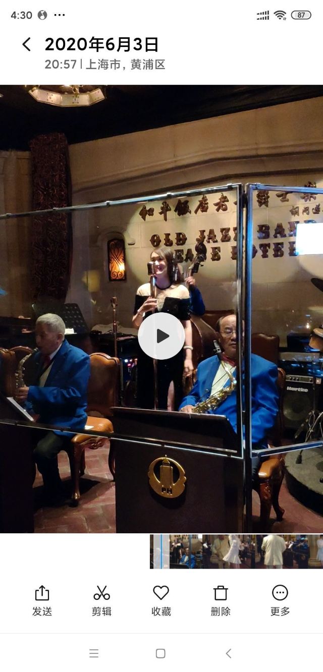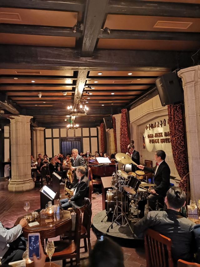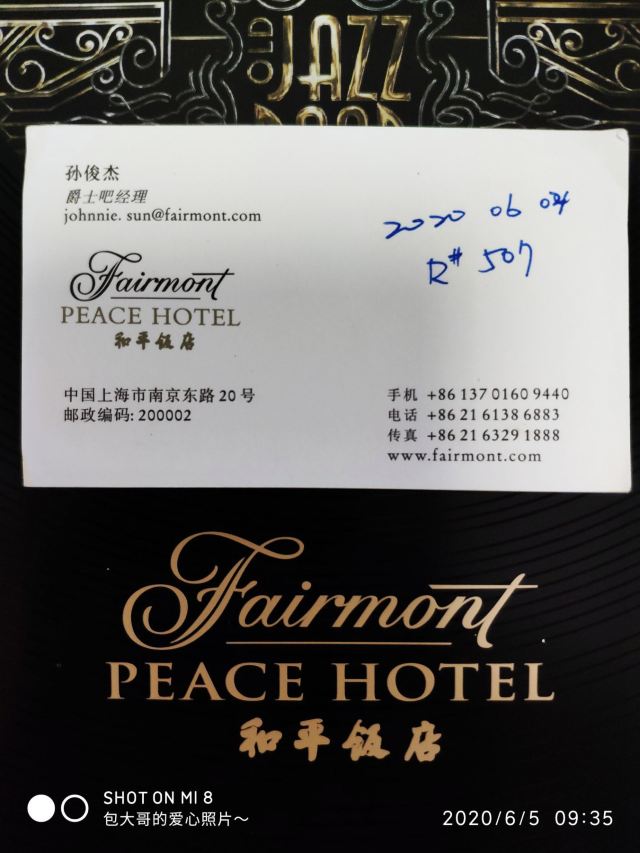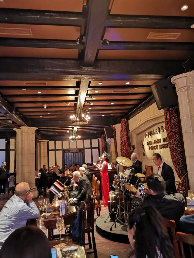 包大哥2020-06 包大哥上海和平饭店3D2N怀旧爵士之旅 和平饭店的《老年爵士乐队》 一直是夜上海的传奇 和平饭店的一大亮点。来上海不能不到外滩 到外滩就一定要来《爵士酒吧》坐坐。 爵士吧就在一楼大堂斜对过 和用早餐的茉莉餐厅是同一个入口;门口从晚上6点就有穿着上世纪30年代暗金色旗袍年轻貌美高挑的的美女领位在前台 带领客人入场就坐。穿过极具有历史感的全木质座椅 昏黄灯色 斑驳的大提琴 衬托出爵士乐队的悠久历史;歌手的着装和演唱的歌曲 也都是老上海金曲;让人恍然瞬间跌回到三零年代纸醉金迷的时光里! 当晚从507号房下电梯转观光电梯到华懋阁晚餐;就在楼下电梯厅遇到一位着西装非常客气的酒店人员向我们住店客介绍爵士吧的开业活动。住店期间二晚的爵士吧活动 都是请他帮我们安排座位点单。爵士吧才开业 工作人员都忙得不可开交 但是他还是发挥上海老派男人的绅士精神 帮我们上上下下打点安排座位 让我们度过了二个愉快的上海之夜。后来方得知 他是爵士吧的Johnnie孙经理。 在华懋阁用餐的空暇时段 餐厅主管ZOE热情地操着和林志玲一样软软嗲嗲的台湾腔 兴奋地向我们介绍1楼爵士吧才重新开幕的讯息;要我们不要错过这个极富夜上海 专属和平饭店的特色节目。而在用餐后 还有餐厅主管Fancy 热心地带我们从9楼华懋阁到1楼的爵士吧;在等候电梯期间 她也特别介绍了当天爵士吧的特色开业宣传活动。 歌手主要是演唱邓丽君等早期红星脍炙人口的歌曲 在现场爵士乐队的用心演奏之下 现场气氛真的是好极了。首首动听的怀旧老歌和多层次的乐声相伴 真是将灯红酒绿纸醉金迷的夜上海迷人气氛绽放到极限。中间还穿插有肖先生的萨克斯风独奏 他仿佛用生命来吹奏 吹到激昂的时刻 脖子上的青筋从脖子上爬到他的板寸头。他时而眼神暗示鼓手节奏 时而低声和他的伙伴协调 他的夜来香吹奏的极好!太棒了~ 疫情期间 连爵士吧的工作人员全程都戴着口罩;乐队成员都是老人家 更是珍贵如熊猫般的国宝;演出台前 也安置了全透明的防护罩。这点和平饭店做的非常到位 也很赞! 因为是饭店的住客 所以定位和入场消费都很方便 没有特别的要求,一通电话给前台或是和餐厅任何一位工作人员定位 他们都很乐意也很快速的安排妥当 完全不用担心会有遗漏的情况发生!这点很赞! 来和平饭店住 吃美食+赏美景+爵士吧 真是一大享受!下次一定再来重逢!