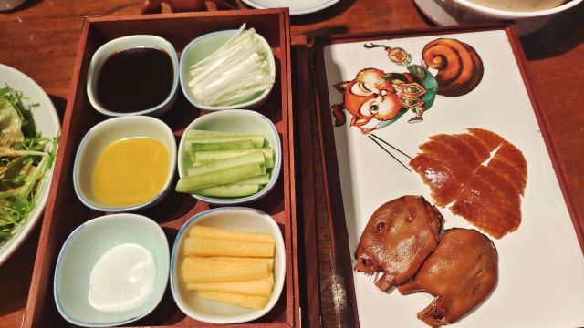 Gubei Roast Duck这个店位置绝佳。 不在古北水镇里面,说明不会那么贵。 正好在古北水镇大门口。 从外观看,店铺的装修风格比较传统,符合烤鸭的风格。 进去之后没有感觉到富丽堂皇,而是灯光比较昏暗。 如果按照套餐点的话,我觉得还是比较贵的,我们单点的一只烤鸭218,一个大拌菜,烤鸭架子加工费十元。这样人均消费大概80左右。 烤鸭味道没有什么特色,中规中矩,还是比较好吃的。