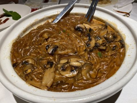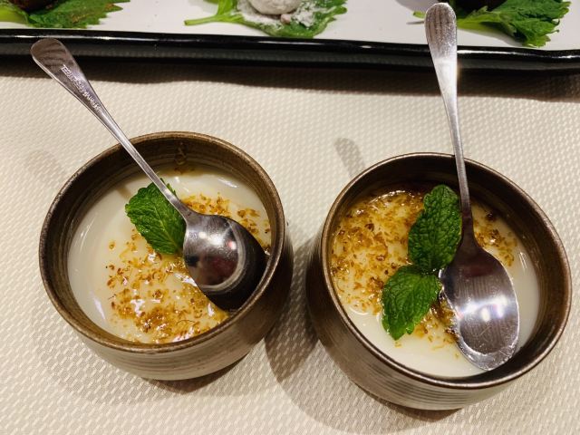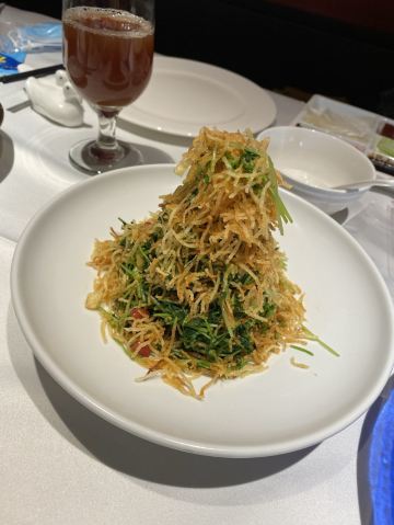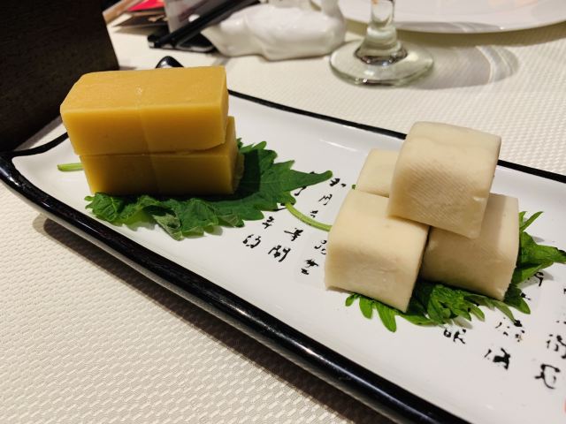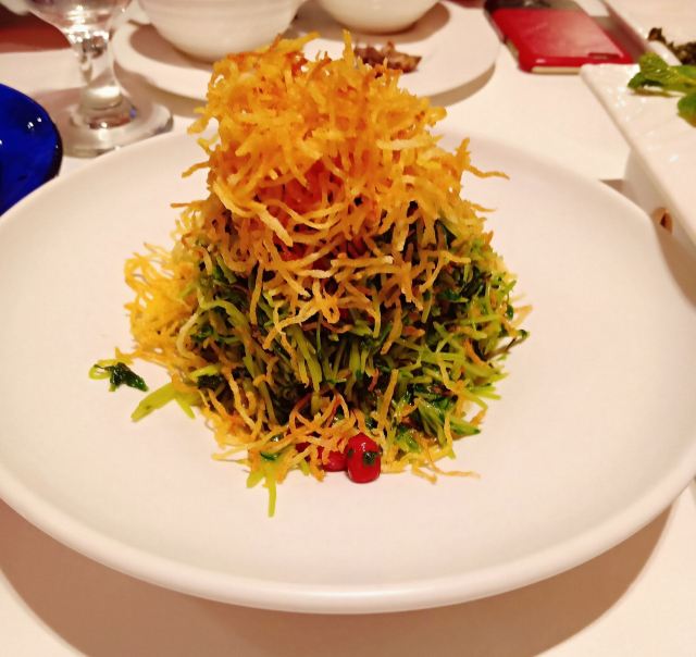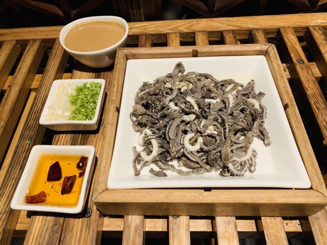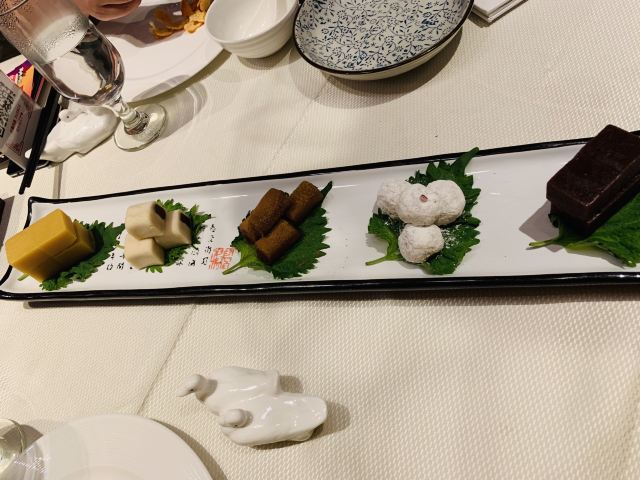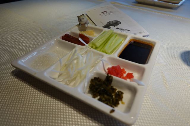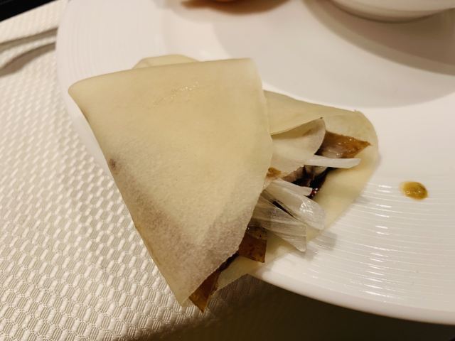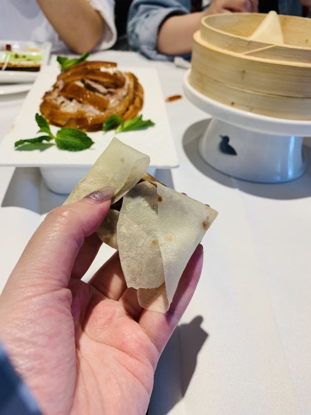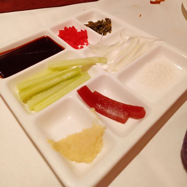 咕噜cloro酥香嫩烤鸭半只,两个人点半只绝对够了,我们最后都没吃完,味道是很美好的,没有鸭肉的腥膳味,鸭皮蘸白糖可以先吃点~ 鸭饼包鸭肉吃法有两种,一种是比较传统的吃法,另一种是在饼皮上涂上蒜蓉,放上鸭皮鸭肉,再放上京葱及咸菜,吃口上有点重口味,但我能接受~ 店家都会热心的教你如何正确的吃烤鸭,还会现场示范如何包烤鸭吃~ (注:烤鸭的蘸酱料是5元一位,也可以两人用一位,这个看个人需要,随意!鸭饼也是另收费的) 京味爆肚,是娟姐的推荐,据她说北京的爆肚可好吃啦,这款爆肚是由各种调料拌匀以后食用,使本身寡淡的爆肚更有味道,我觉得吃口上很有嚼劲,店家会提醒最好的食用时间是5分钟里吃完它,不然冷了以后我发现嚼起来就比较费劲~ 芥末鸭掌,是真的重口,鸭掌完全去骨上桌,这道菜的重口之处就在于它的酱料,吃的时候,根据个人口味蘸芥末酱料的多少,每每吃上一口就是那种直冲脑门的那种辣,一不留神多蘸点儿,就是眼泪在眼眶里打转~按娟姐的原话就是,感冒的时候吃这道菜感觉鼻子都通畅了[捂脸] 巧拌豆苗,是为前面的重口味进行调剂的清爽时蔬~ 小吃拼盘,有豌豆黄,芸豆糕,驴打滚,艾窝窝,小豆凉糕,五款组成,芸豆糕是精致细腻,艾窝窝名字都是第一次听说,吃到金桔的味道,一问工作人员才知原来是五仁馅儿的[愉快] 宫廷杏仁豆腐,是他家的招牌甜品,薄荷叶点缀,桂花撒于表层,舀上一勺,入口是如布丁般的豆腐因为桂花香气的加入应该还有一些蜜糖的甜蜜~美味~