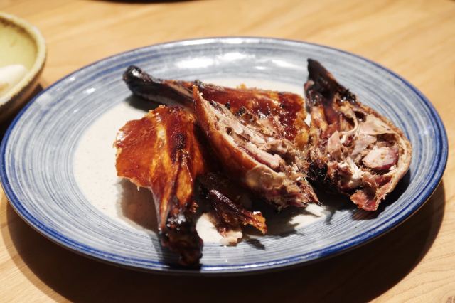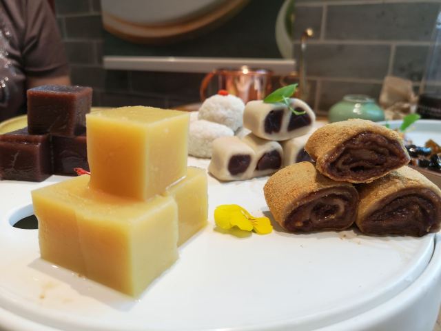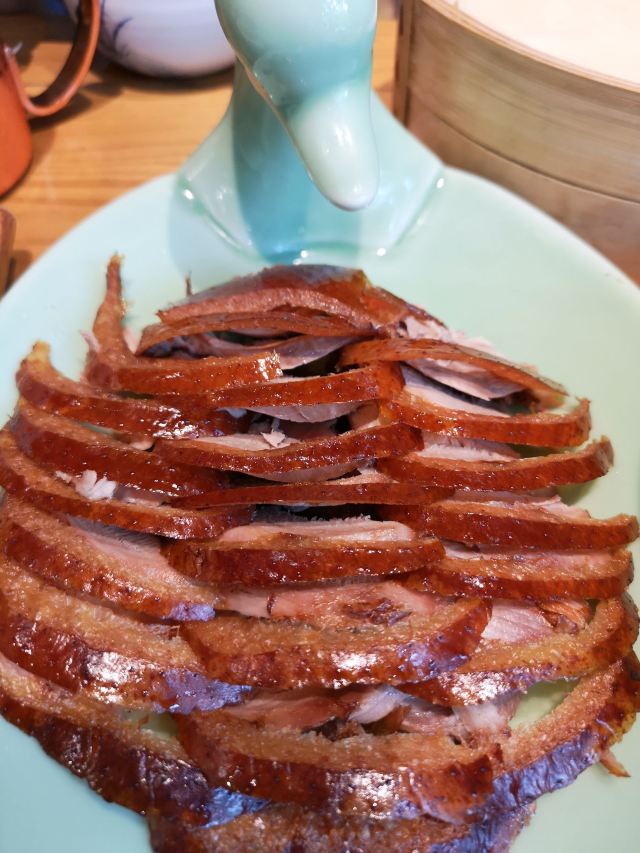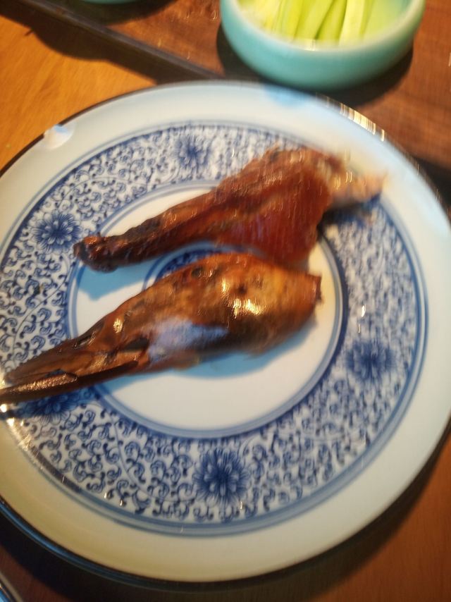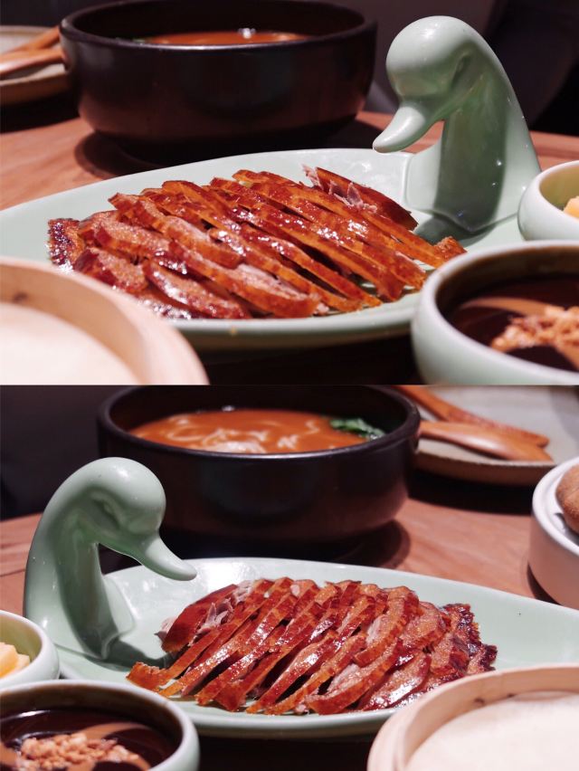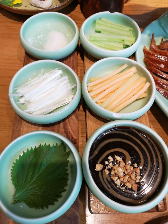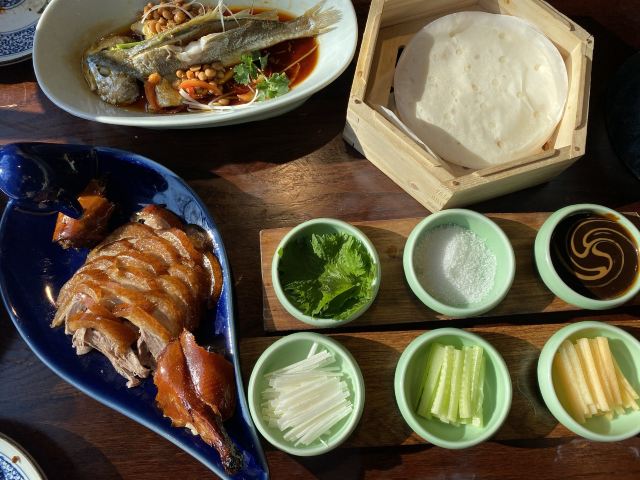琳丁来吃宅门一口酥烤鸭,开餐先有京城四小件,餐后又有宫廷点心集合,热菜上得快,一桌子热热闹闹。 烤鸭:配齐鸭头鸭腿,蘸料共享,甜面酱加麻酱开辟新吃法,口感温吞,偏瘦不香。 福到四九城:花生、芥末墩、肉皮冻、红果和咯吱盒,正常水准,话匣子小吃。 灌肠爆三样:创新菜,但都不如单独的菜品好吃,炸灌肠湿乎乎地变软了,腰花切的太碎。 浓汤板栗扒白菜:又是改良菜,花椒下得很重。 牛腩煲:太咸了,有点浪费食材,配菜用的板栗,和浓汤重复,而且也不是季节干果,不是很好吃。 炒时蔬:喜欢这道菜,因为有好多蔬菜呀! 水平很家常,点餐前记得嘱咐少油盐,包间太尴尬,像被抛弃的无人岛,小楼梯爬得还略艰难,小院子不错,接待的都是男生,清洁的都是阿姨,马路边感应收费。