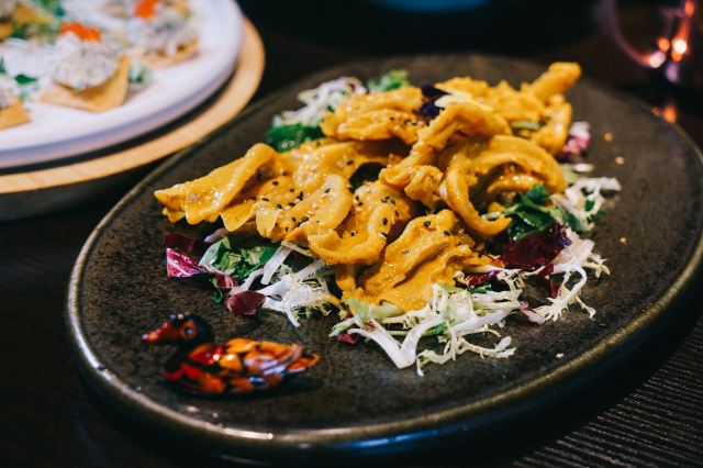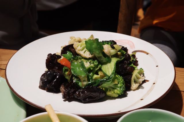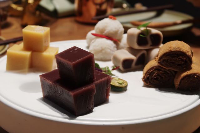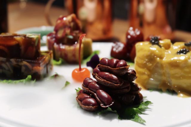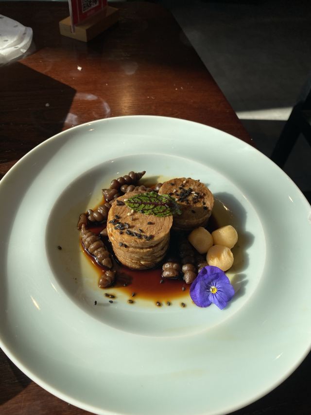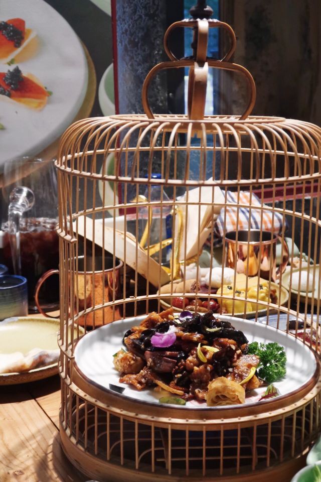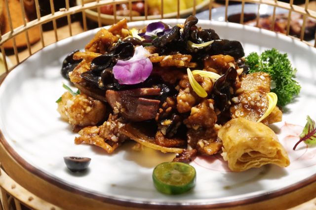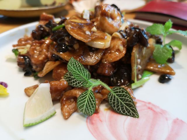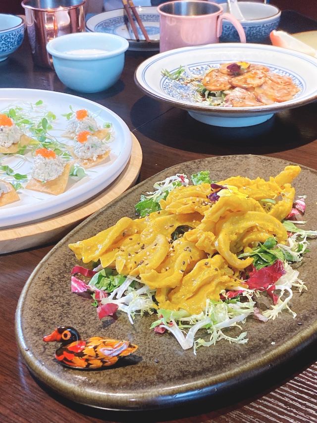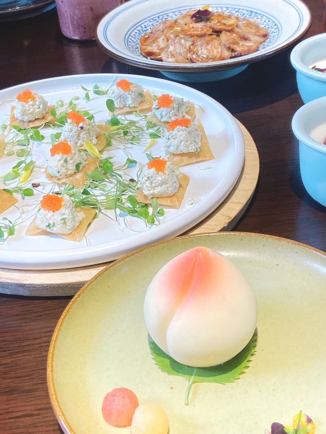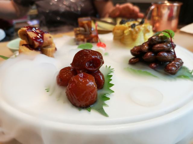 枫行Maple1️⃣[鱼子酱香椿小豆腐],香椿拌豆腐属于传统凉菜了,点卯参考了西餐摆盘方式,用鱼子酱点缀,味道协调,香椿和豆腐的味道浓烈,样子一顶一的好看。 2️⃣[老坛六必居酱菜配去骨猪手],用蔬菜打底,去骨猪手切片,虽然分量不大,但是非常开胃。遗憾的是大家都没有注意到另一主角老天六必居酱菜,撤下去之后才回过味儿来。 3️⃣[京彩小点组合],都是很传统的北京小吃,艾窝窝、绿豆滚、豌豆黄、红豆糕。新鲜制作,糯米很软,分量也不小,摆在平盘上非常好看。不过上的有点早,吃完就半饱了。 4️⃣[灌肠&炸咯吱],两道老北京小吃,灌肠切得厚,没有薄薄边缘的焦脆,但配着蒜汁一口接一口,就是停不下来。 5️⃣[仙桃杏仁豆腐],出人意料的一道甜品,白巧克力做的仙桃壳特别可爱,欣赏了半天。用瓷勺敲破,里面的杏仁豆腐噗的一下弹了几弹跳出来,清清凉凉的口感,非常棒。 6️⃣[老北京酸奶],用果酱和花瓣点缀的酸奶,第一次在北京菜馆里见。难道大厨跟法餐老师学习过?味道不很甜也不很酸,女生会喜欢。 7️⃣[功夫干炸丸子],京味菜馆里的经典菜,丸子一定要手打出劲儿,炸起来油温合适,才能外酥里嫩。容器是个竹编葫芦,非常别致。 8️⃣[点卯酥皮大虾],让大家想起了那小馆的经典菜。虾比较大,去了虾线,沿背切开,甜甜的酱汁渗入到虾肉内部,又是好看好吃的一道。 9️⃣[点卯宫保三样],三样是哪三样?鸡丁、鱼丁和大虾。用红曲上了色,整道菜红彤彤的,在一桌子菜肴里,这道略显平庸,酱汁发甜,其实还可以从色和调味上改进。 🔟[四九城文火煨牛三样],哪牛三样?牛板筋、牛肉和牛腩。板筋很厚实,火候到了,软硬度很合适,石锅里的牛腩和牛肉热乎乎的,如果没点别的菜,浇汁能下好几碗米饭。 1️⃣1️⃣[老北京芥末鸭掌],经典的鸭肴,干净的鸭掌好大一条,满满的黄芥末浇上,一吃发现味道做了改良。没有早先黄芥末那种窜鼻子的辣,味道很柔和,与鸭掌脆脆的口感中和在一起,很适合年轻人。 1️⃣2️⃣[一口酥烤鸭],其实我们就为了吃烤鸭来的,但因为挂炉现烤,最后才上,基本上已经吃的比较饱了。不过我们竟然一口也没剩的又吃掉了这只鸭子。