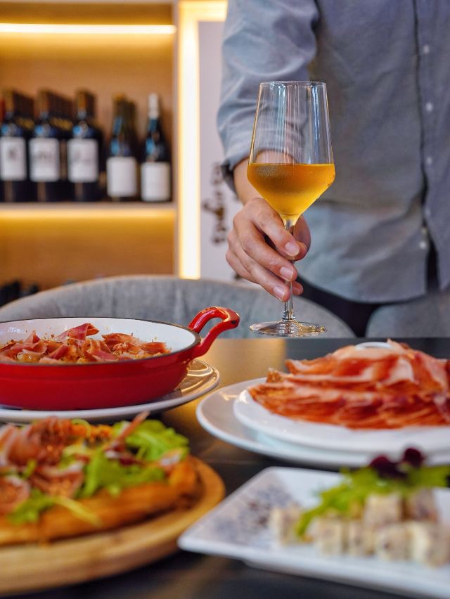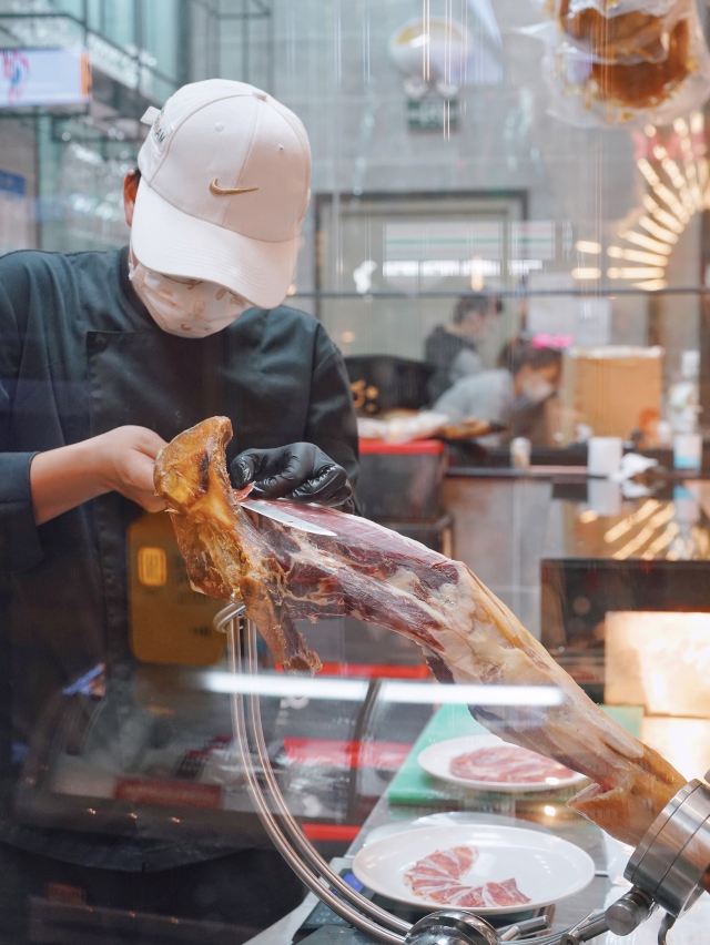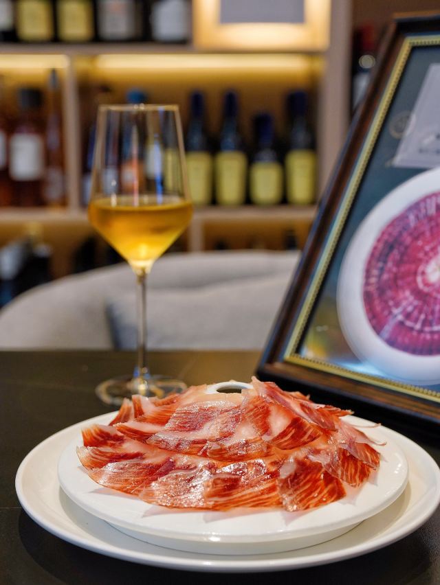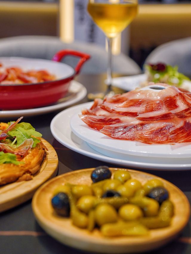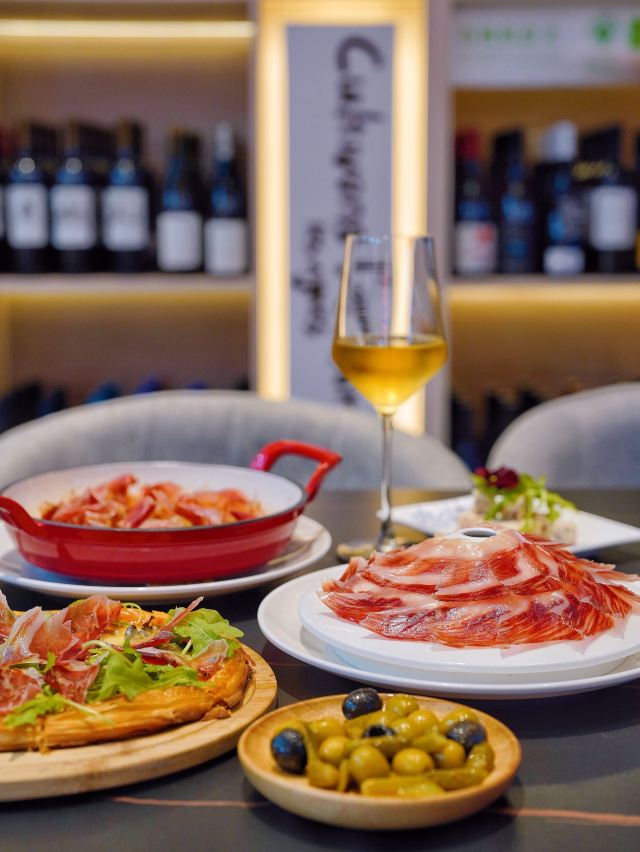 今天推荐的这家🇪🇸食葡|西班牙火腿&WINE 🇪🇸,让我实现了火腿自由‼️无论是白天用餐还是夜间续摊,都超有氛围感✨ 🥓5J黑标伊比利亚火山盘🥓 霸气外露的火山盘一出场,一秒点燃肉食爱好者的渴望,现点现切的5J火腿,不愧是西班牙美食瑰宝,每一片都散发出油润光泽。 据说选用的伊比利亚黑毛猪,天然草场放养,吃橡果长大,它们能成为火腿,是“猪生”最高的荣誉🎖谁能拒绝上天的馈赠⁉️ 每条5J火腿都在百年火腿窖中匠心打造5年以上,肉的鲜甜中夹杂着榛果的香气,并且越嚼越香,搭配一杯daily wine美哉美哉🥂 🧄大蒜虾🍤 火腿均匀覆盖在大虾表面,自带鲜香buff,饱满Q弹的虾肉蒜香浓郁,把整体层次感又提升了一个level📈 🍄蘑菇黑松露酱火腿薄脆🍕 层层起酥的薄脆托起片片火腿,酥皮与火腿之间抹满菌菇黑松露酱,被鲜香口感一击即中💕 没想到💰人均200+就能喜提一桌全火腿宴,还有切达干酪🧀橄榄🫒等佐酒小食,好吃是好吃,就是有点费酒😅