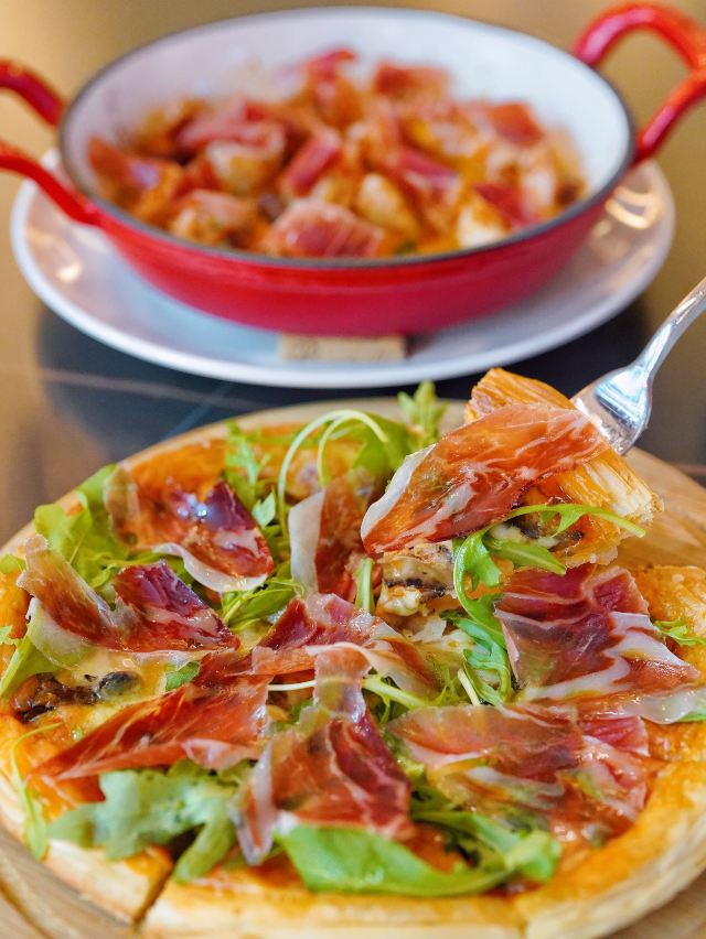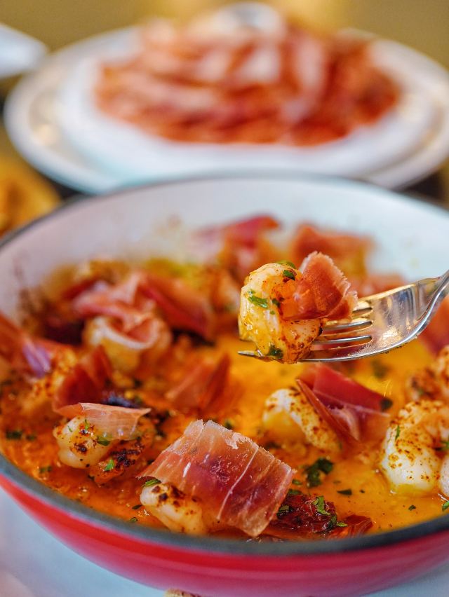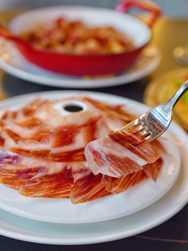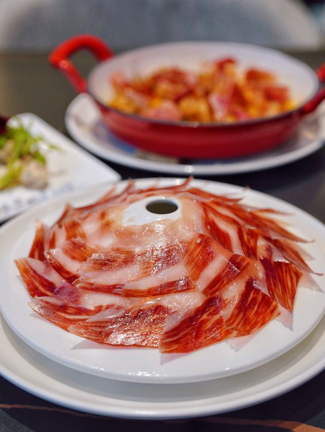 加油干饭呀今天推荐的这家🇪🇸食葡|西班牙火腿&WINE 🇪🇸,让我实现了火腿自由‼️无论是白天用餐还是夜间续摊,都超有氛围感✨ 🥓5J黑标伊比利亚火山盘🥓 霸气外露的火山盘一出场,一秒点燃肉食爱好者的渴望,现点现切的5J火腿,不愧是西班牙美食瑰宝,每一片都散发出油润光泽。 据说选用的伊比利亚黑毛猪,天然草场放养,吃橡果长大,它们能成为火腿,是“猪生”最高的荣誉🎖谁能拒绝上天的馈赠⁉️ 每条5J火腿都在百年火腿窖中匠心打造5年以上,肉的鲜甜中夹杂着榛果的香气,并且越嚼越香,搭配一杯daily wine美哉美哉🥂 🧄大蒜虾🍤 火腿均匀覆盖在大虾表面,自带鲜香buff,饱满Q弹的虾肉蒜香浓郁,把整体层次感又提升了一个level📈 🍄蘑菇黑松露酱火腿薄脆🍕 层层起酥的薄脆托起片片火腿,酥皮与火腿之间抹满菌菇黑松露酱,被鲜香口感一击即中💕 没想到💰人均200+就能喜提一桌全火腿宴,还有切达干酪🧀橄榄🫒等佐酒小食,好吃是好吃,就是有点费酒😅