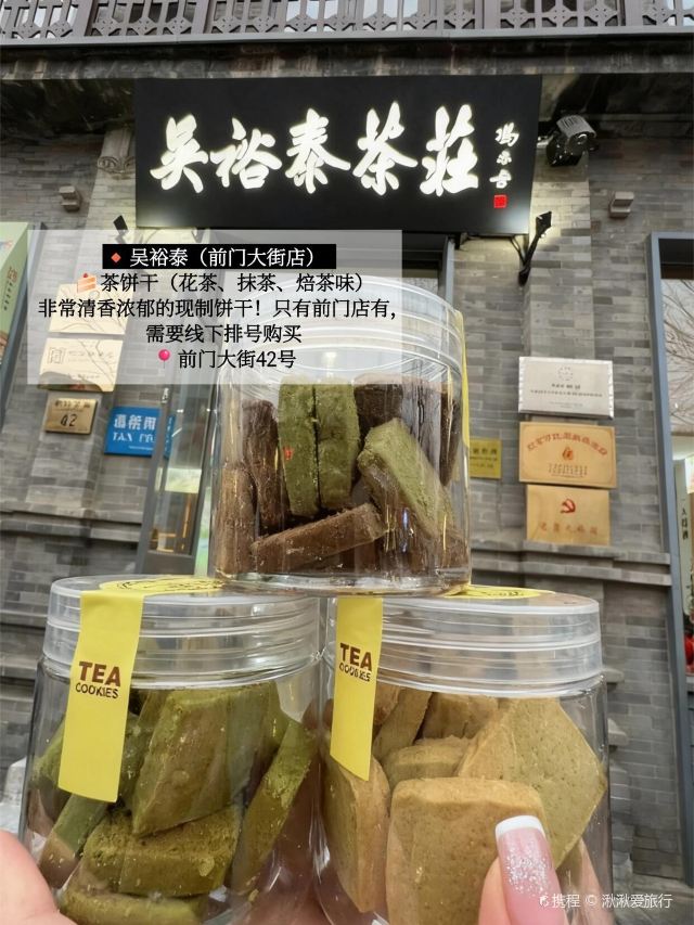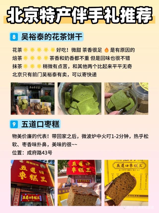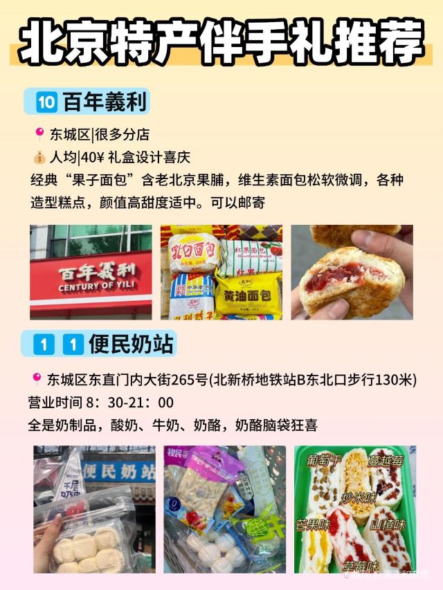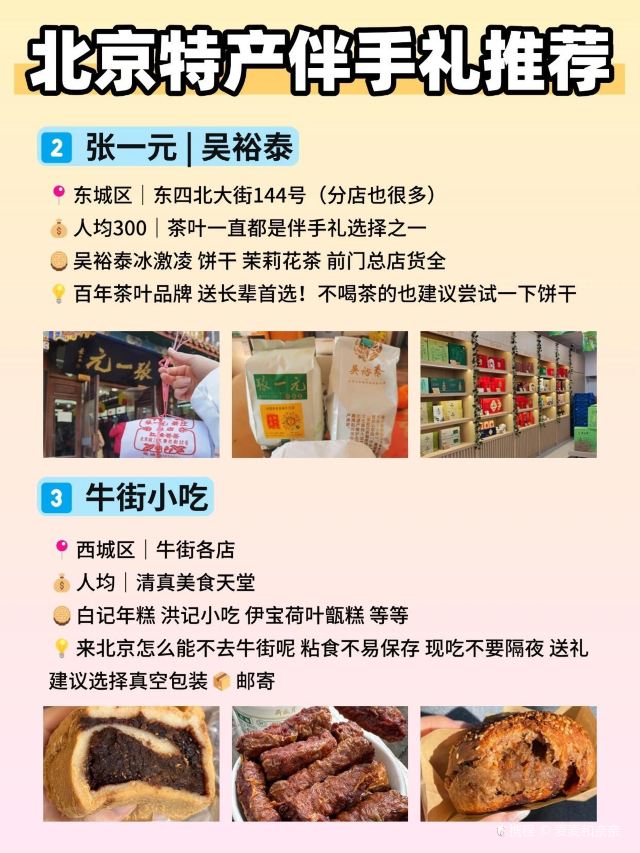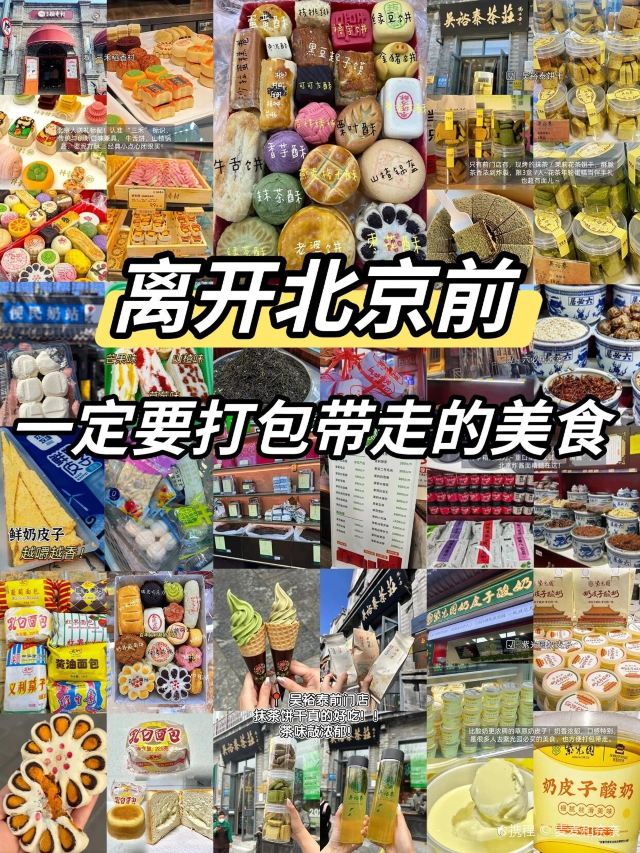 这才是北京特产!!北京朋友强推的伴手礼来北京买特产只有稻香村?no! 还有超多可以打包带走的特产美食 分分钟获得家人、朋友的芳心✌好吃到直呼超会买~ 🔸吴裕泰(前门大街店) 🍰茶饼干(花茶、抹茶、焙茶味) 非常清香浓郁的现制饼干!只有前门店有,需要线下排号购买 📍前门大街42号 🔸紫光园(前门大栅栏店) 🍰奶皮子酸奶 身边吃过的人都赞不绝口!奶香浓郁、口感丝滑,很多门店可买 📍大栅栏商业街31号 🔸梅潭村(北新桥店) 🍰醍醐芝士酥、抹茶芝士酥 芝士酥超惊艳!外皮薄软入口即化,芝士的咸香浓郁醇厚 📍东直门内大街288号 🔸茶饼斋(北新桥店) 🍰开心果奶糕、茉莉毛峰乳酪糕 雍和宫排队王!奶酪脑袋闭眼冲 📍雍和宫大街167号 🔸百年义利(北新桥店) 🍰麻酱威化饼干、椰丝饼 老北京认证的老式糕点!咸甜口威化、山楂馅椰丝都是仙品 📍东四北大街48号 🔸德南面包房(好运街店) 🍰肉桂苹果卷、奥地利奶酪卷 超正宗的德式面包!秋冬吃肉桂奶酪超治愈 📍好运街1-24号 🔸1983面包坊(崇文门店) 🍰榛子拿破仑、巧克力拿破仑 北京拿破仑天花板!酥皮奶油超细腻 📍崇文门西大街2号 🔸老回回小吃(百万庄店) 🍰驴打滚、豆馅烧饼 豆沙星人狂喜!满口豆沙馅,绵密清甜 📍百万庄北街9号 #朋友圈被问爆的地方 #和朋友出去撒欢儿 #美食旬味会