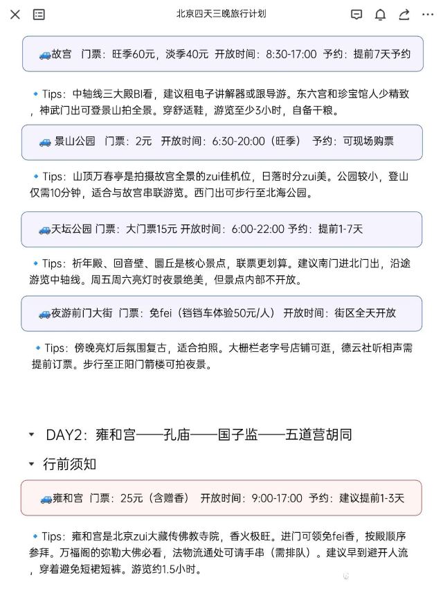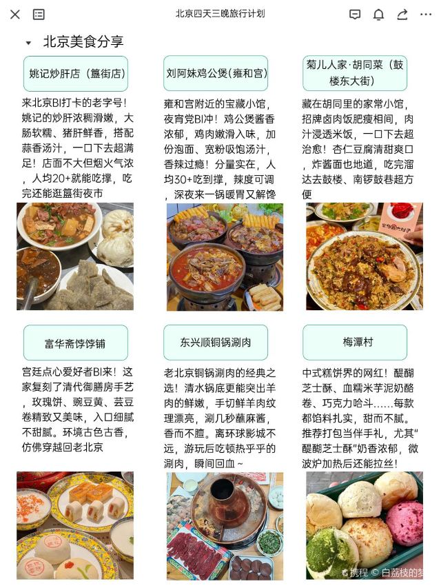 **🗺️ 4天“不绕路”神仙路线图** 这是我朋友熬夜做出的完美路线,真的丝滑到我当场落泪!😭 我朋友的美食雷达就没失灵过!这几家都是她精挑细选的,闭眼冲!👍 姚记炒肝(簋街店) 🥣:一大早就去挑战本地人的心头好!味道很特别,值得一试! 刘阿妹鸡公煲(雍和宫)*🐔:真的香到走不动道!酱汁浓郁,鸡肉超嫩,拌饭一绝! 菊儿人家·胡同菜 🥘:藏在胡同里的宝藏小馆,每一道菜都充满了家的味道! 富华斋饽饽铺 & 梅潭村*🥮:宫廷点心yyds!不仅颜值高,味道也超棒,买回去送人倍儿有面子! 东兴顺铜锅涮肉*🥩:手切羊肉超新鲜!配上麻酱小料,这才是北京的冬天啊!(虽然我们夏天去的也很好吃😂) 快@你身边那个超会做攻略的J人朋友,告诉她,你爱她!这辈子我都跟定我的神仙朋友了!💖 #北京旅行 #刚从北京回来听我说 #北京美食攻略 #故宫的正确打开方式