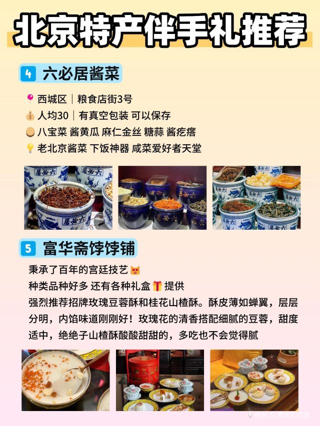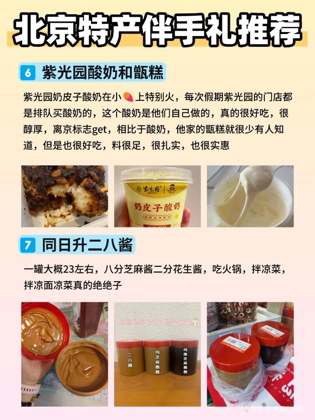 喽宝子们~我是@小🐑爱溜达✨ 今天终于把被问了800遍的「北京必买伴手礼清单」肝出来啦!🥰 照着这份攻略买,绝对不踩雷!自己吃送人都超合适~ 每一款都是亲测好吃不贵的宝藏💖 🏯【颐和园·上上签饼干】 📍地址:颐和园西九间 💰价格:38元/桶 ✨特色:每个饼干都刻着超吉利签文~ 一口奶香十足 逛园子顺便带一桶 仪式感拉满💯 建议游玩颐和园时顺手get!✨ 🥮【梅潭村·糕饼铺】 📍地址:多家分店 💰价格:蛋黄肉粽10元/个 豆沙粽8元/个 ✨特色:爆馅预警⚠️ 蛋黄五花肉香到上头 豆沙绵密不齁甜 当早餐吃幸福感直接拉满!🤤 🥮【三禾稻香村(零号店)】 📍地址:东四北大街152号 💰价格:牛舌饼5元/块 山楂锅盔4元/块 铛铛车礼盒58元/盒 ✨特色:认准"三禾"标志❗️ 牛舌饼的椒盐馅一口掉渣 铛铛车礼盒复古可爱 送人首选🎁 🌸【饽饽房七十二候饼】 📍地址:景山前街4号(近故宫) 💰价格:九宫格约68元/盒 乳酪蛋黄12元/块 ✨特色:故宫边上的新晋顶流❗️ 按节气做的中式点心 颜值美到哭 乳酪蛋黄绵密不腻 越吃越上头😍 🥛【紫光园·奶皮子酸奶】 📍地址:多家分店 💰价格:8元/杯 ✨特色:浓到能拉丝❗️ 本地人冰箱常备 买6瓶装送人绝对被夸爆👏 🥬【六必居·酱菜】 📍地址:前门外粮食店街3号 💰价格:麻仁金丝15元/袋 八宝菜20元/罐 ✨特色:600年老字号❗️ 酱菜爽脆不咸 配粥拌面绝绝子🍜 🍵【张一元·茉莉花茶】 📍地址:前门大街86号 💰价格:依品种不同 ✨特色:老北京茶庄天花板! 花香透骨 新手必入白雪针王 性价比超高💯 🍪【吴裕泰·茶味饼干】 📍地址:前门大街42号(仅此一家现烤) 💰价格:18元/盒 ✨特色:全北京独此一家❗️ 每人限购3盒 花茶和抹茶味都超浓不甜腻🍵 🥮【老回回·小吃】 📍地址:多家分店 💰价格:豆馅烧饼3元/个 糖花卷4元/个 ✨特色:馅料多到炸裂💥 豆馅烧饼皮薄馅大 糖花卷裹满麻酱 碳水快乐谁懂啊家人们!🤩 🍞【宫门口馒头】 📍地址:香厂路1号 💰价格:贝勒红豆卷5元/个 烤馒头2元/个 ✨特色:红豆卷里塞满板栗核桃❗️ 馒头奶香扎实 当主食能吃一周 平价又实在 yyds!💪 💡【购买攻略】 💰 平价王:宫门口馒头、老回回(人均5r吃饱!) 🎁 体面送礼:稻香村礼盒、饽饽房九宫格 🏆 自留宝藏:紫光园酸奶、吴裕泰饼干 赶紧码住这份攻略! 下次来北京就知道买什么了吧~ #北京伴手礼 #北京必买 #传统老字号 #北京旅游攻略 #北京美食打卡