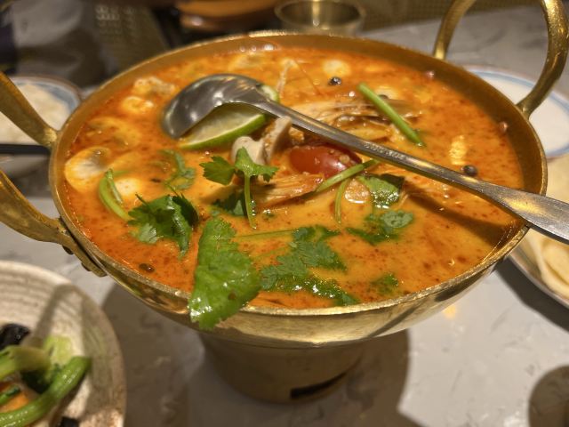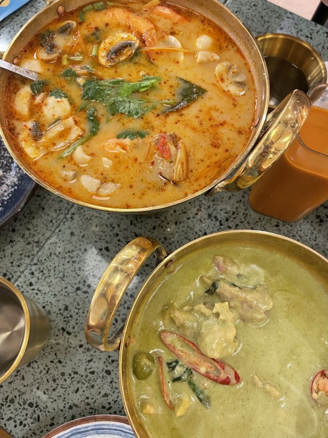 在APM里的泰国菜~招牌不太显眼~在慢慢的爱对面~ 绿咖喱鸡肉~咖喱很浓郁~搭配的鸡肉很嫩~微微的甜香 冬阴功汤~超级好喝,一连喝了好几碗~酸酸的味道~里面的虾非常大~ 虾酱空心菜,虾酱的味道刚刚好,不会很臭,越吃越好吃😋 榴莲小方,满满的榴莲香,不甜不腻~推荐