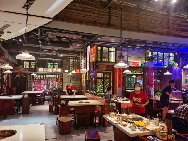 西单大叔在卤校长体验超正宗重庆火锅—— 今天是有人请客,请客的人非要带我来吃西单老佛爷里这家卤校长重庆火锅,我上网一查看人家说等位要一小时,就有点儿想打退堂鼓,不过请客的人拉着我说一定要来吃这家店,因为简直太好吃了,就算等位要一小时也是非常值得的,于是只好跟着来了。 不过中午十二点多到店之后发现门口确实摆了几十把等位用的椅子,但却并没有人在等位,店里倒是满满当当,店员说现在就有位,还真是意外。店里布置得非常有特色,整个设计成了八十年代胡同小巷那种感觉,是整体的一个布景,边上的包间就是一排平房的样子,对几十年前的城市风貌还原度颇高,年代感十足,店里空间挺大,每张桌之间距离适中,舒适度还是比较高的。跟着领位的服务人员往里走,穿过外面的大空间,走过一条窄道,发现里面还有一个比较小的空间,也摆了几张桌子,今天坐了这里。透过门缝看到旁边包间里的情景,就是个挺大的屋子,摆设布置也完全是八十年代普通民居的景象,装修风格、家具、物什等等还原度也都很高,就像是原来在家请客的感觉。 点菜是扫码点,菜品比较齐全,重庆火锅经典的内容基本上都有,另外几种辣卤也是这里的特色,看多来聚餐的,基本上就是把所有的辣卤都上一遍,应该是必须要体验的。大大小小点了二十几样吧,麻辣牛肉、奶香嫩牛肉、千层肚、羔羊卷、午餐肉、鸭血条、牛肉丸、掌中宝,还有几样素菜,小吃点了小油条和小酥肉,辣卤只点了一个卤鸡爪。然后卤校长还有个特色就是甜品不限量供应,现在是九种甜品,要去供应甜品的窗口排队,窗口有甜品菜单,每人排一次队可以点两样,后面想吃还可以再来排,这个窗口基本上就是一直有人在排队,里面做甜品的师傅一定很辛苦,全程不得休息。小料也是自取的,小料台有两处,调料的品种倒是不多,主要就是可以调麻酱料或者香油蒜泥料,旁边墙上有自制调料的几种配方,可以参考。重庆火锅就是配香油料,麻酱应该是为了适应北方人的口味,反正在重庆吃火锅是没见过有提供麻酱料的,不过这里的麻酱调得很好吃,味道比不少铜锅涮肉的店都不差,这个有点儿意外。所有菜品都不错,没有踩雷的,卤鸡爪很软糯,难怪辣卤是人家店里的招牌呢,下次一起吃饭人多的话确实应该把所有辣卤都点一遍尝尝。 这边的服务也是很好的,虽然人多满座,但是服务人员的数量充足,服务上完全可以让每桌的客人都不受冷落,而且主动性还很强,又都很热情。