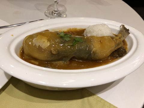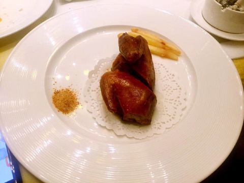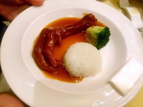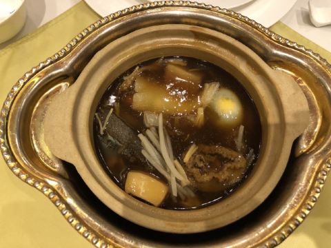 是按位点菜的,主菜有佛跳墙和海参等,配菜自己任意点,按人头数上菜量。福跳墙算好吃吧,用料比较足,汤汁浓郁。