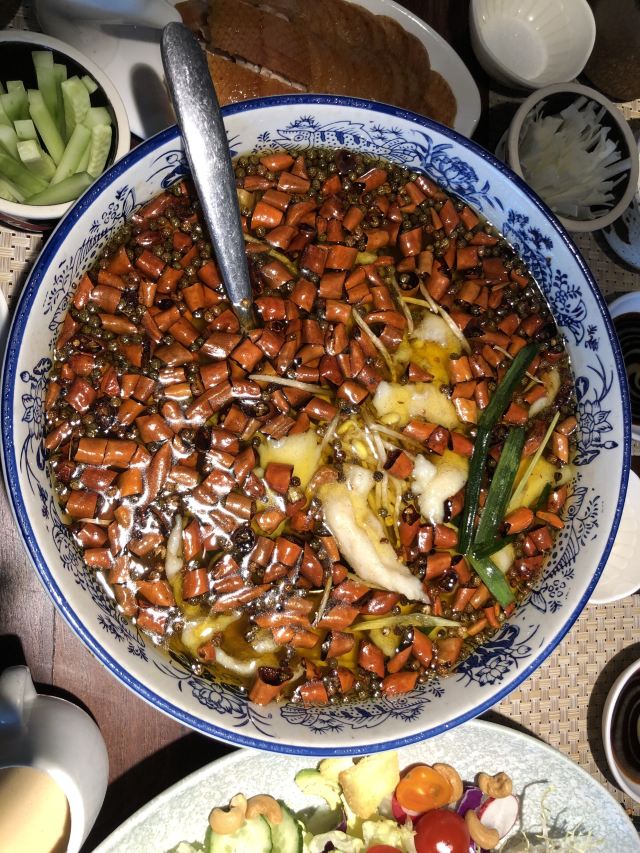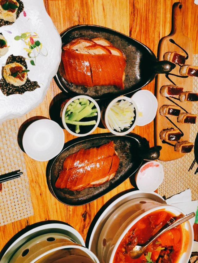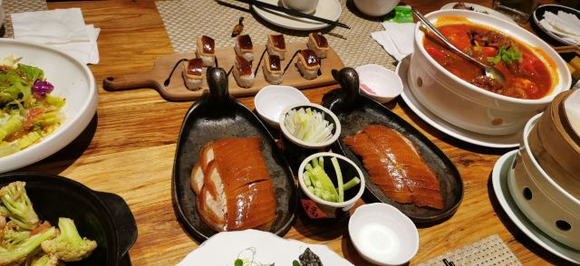 果木烤鸭,成都香辣水煮鱼柳,德永甩甩沙律,烤鸭套餐,鸭肝酱寿司(枣香烤鸭配四件),酥炸小黄鱼,坚果酸辣虾球,大白菜粉丝鸭架汤,牛肝菌爆炒小白菜苗,香辣美容蹄,糖醋小排,炒土豆丝,冰皮抹茶糕,香辣水煮鱼柳,蘑菇流沙包,清爽葱油鸡