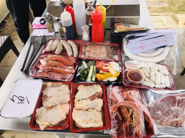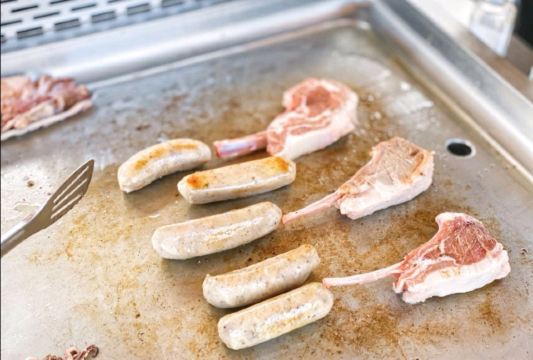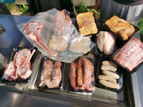 烤肋排,战斧牛排,红虾,羊排,烤牛仔骨,烤鸡,鱿鱼,香肠,炒饭,培根,雪鱼饭,面包篮,年糕,秋刀鱼
