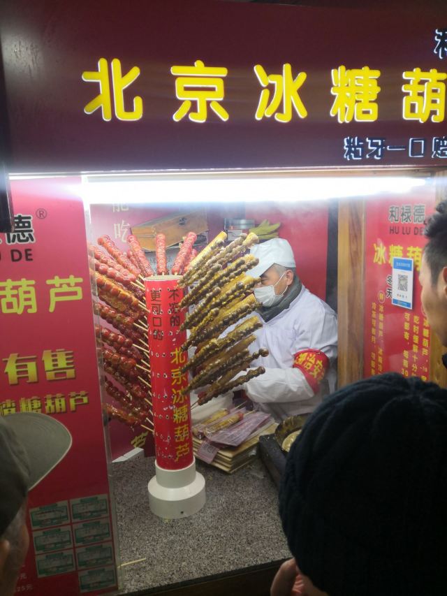 应该是北京最地道现做糖葫芦,就在东四地铁口朝内菜市场入口处,小小的铺子,客人络绎不绝,味道的确有别于其他家的,连我这个平时不爱吃糖葫芦的人,尝了一口后也欲摆不能