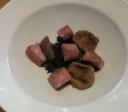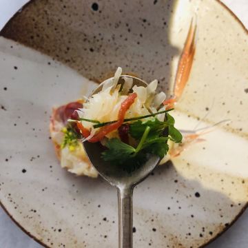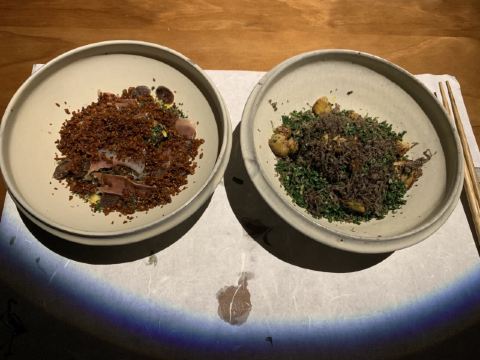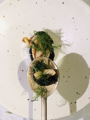 伊來#点评有礼# 「炸公鱼配香菜脆米」 可是把这道菜视为传统小吃综合体,脆米像烧烤味薯片,炸鱼像麻麻炸的虾片。第一道上这个,先把口味调重,头儿开的不错。 「生渍海鳌虾」 虾肉被“剔骨”,不用剥壳,直接夹着吃就可以,非常省心。虾肉晶莹幼滑,与搭配的柚子肉相映成趣,酸甜鲜香,蔚为大观~ 「墨鱼汁鲍鱼」 鲍鱼肥厚,浸染咸鲜略带药香的墨鱼汁,别有风味~ 「桃脂凝露」 香甜莹润,果肉清晰可辨,余香满口~ 「烤降霜级黑毛牛」 国产北方牛肉,六分熟,刚好是不会有血水渗出的火候,切面肉色粉嫩逗人食欲~ 肉质凝浑一体,没有肉末碎渣,是块好肉! 「鹅肝松露饭」 米饭粒粒饱满,松露滋润,鹅肝肥美,充分搅拌香浓醇鲜,不自禁会捧起碗来吃,真喜欢这挡口的劲儿! 「老白茶配甜品」 白茶不白,茶香绕梁~ 枣糕甜美,芝士咸香,柚子酸甜,五味杂陈,层次感分明。