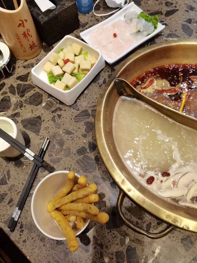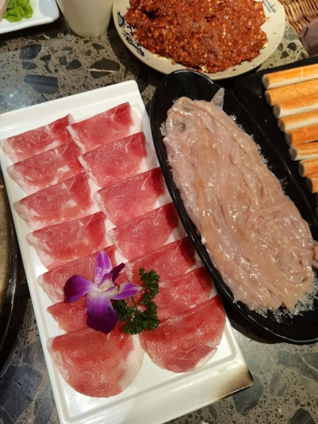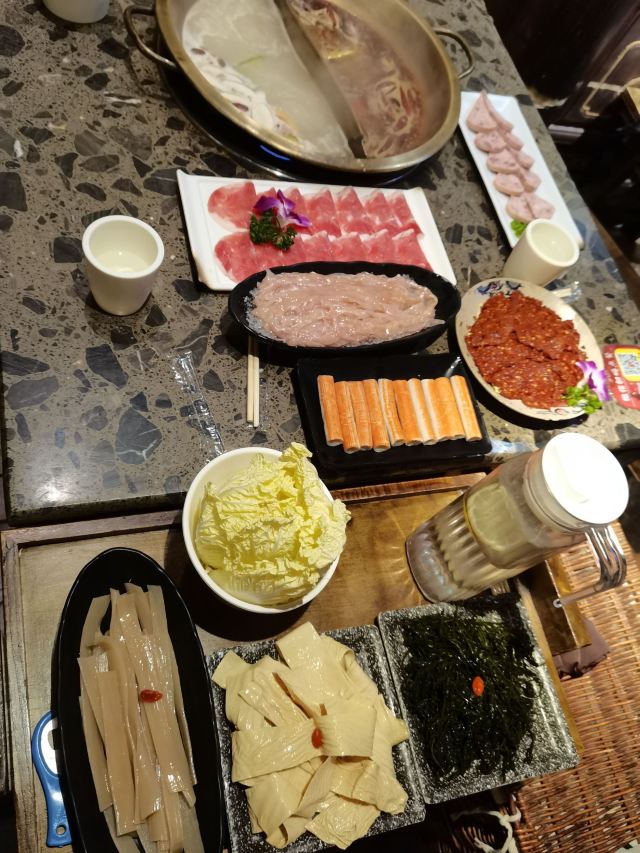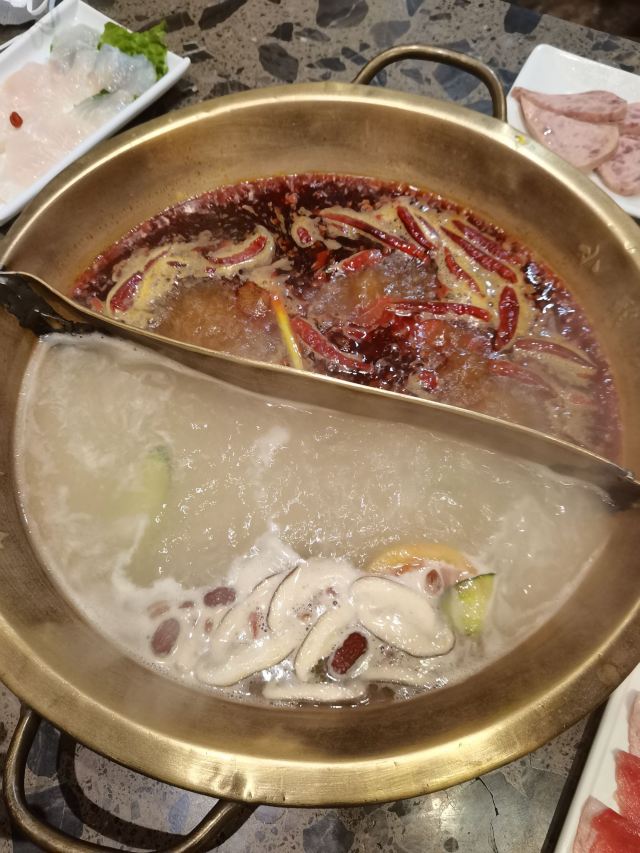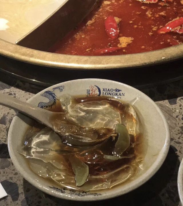 四川著名的小龙坎,非常出名,店内古香古色,环境很好,店员热情。羊肉很鲜嫩,荤菜点了“空运”黄喉、“空运”鲜毛肚、猪脑花、鸭舌、去骨鸭掌、牛肉,素菜点了海带、藕片、笋片和豆皮。空运的应该是四川本地的吧,口感不错。