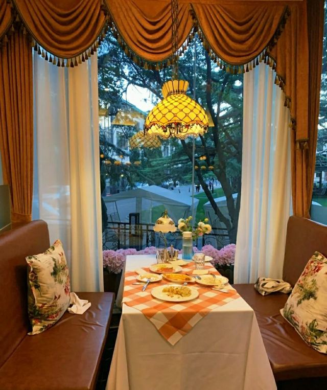 Fu Er Jia Restaurant伏尔加餐厅在北展北门附近,最好跟着导航走,位置有些隐蔽。要是有演出,吃完饭,走七八分钟就到北展了,特别方便。 选了几样招牌菜,来说说味道如何 首都沙拉和红菜汤,几乎是到俄式餐厅必点的,味道都不错。 冷酸海鲈鱼,挺推荐的,简单说就是糖醋里脊口味和上海熏鱼的口感,不过鲈鱼没什么刺,吃起来更爽,酸甜开胃的冷菜 闷罐牛腰窝,份量不大,特别喜欢上面的高热量面包酥皮,戳破蘸着里面的汁吃,很香,牛肉有些偏瘦,口感就有点柴,不是那么嫩。 波罗地海黑啤酒,味道很正,一点不苦。 来这儿建议提前订位,会优先安排靠窗的座位,更舒适,尤其是夕阳的时候,阳光照在餐厅的壁纸上,桌上还有一盏复古的小台灯,感觉特别棒。 进门除了感受俄式风情,还有点国营餐厅的感觉,服务员态度就特别好。菜量适中,不过有6[%]的税费呦~