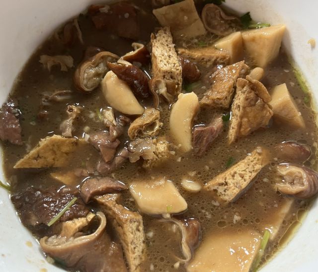 卤煮火烧是北京名小吃,把火烧和炖好的猪肠猪肺放在一起煮,一碗热腾腾的煮物,再配上店里的蒜泥、辣椒油、豆腐乳、韭菜花等酱料,略微重口,却是老北京们冬日里很爱的夜宵美味。北新桥卤煮老店在北京非常有名,这家的猪肠处理的非常干净,既留有油水,又不带一点异味,香味厚重却不腻人,一口下去满嘴浓香,让人非常满足。