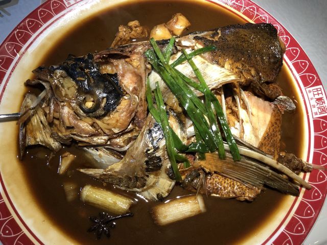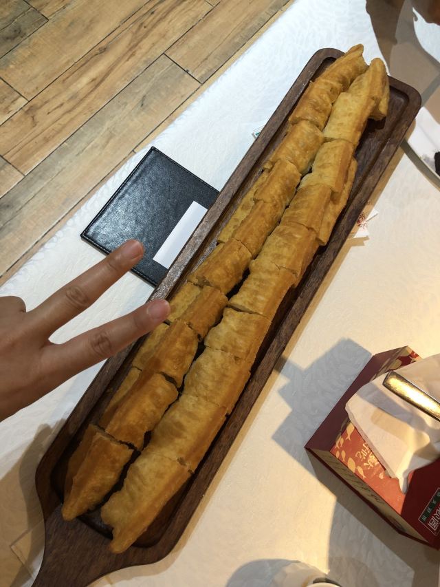 疫情期间店里吃饭的人不算多,基本隔桌坐,但是外卖听着不少,服务员忙叨叨的。 鱼头还是一如既往的好吃,不太想吃辣,所以要的传统口味,实话讲,吃几大口中之后会觉得有点儿腻,不过没关系,我点了沙拉和腌萝卜,清爽可口,就是来解腻的! 新出了一尺八大油条,气势很足啊,相比这下我修长的手都显得又黑又小。