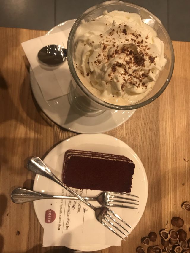 Costa Coffee昨天和闺蜜一起去复兴门百盛逛街,看到Coster就忍不住走进店里。闺蜜由于怕喝了咖啡晚上失眠,又怕吃了蛋糕长肉,所以我只为自己点了一份中杯提拉米苏拿铁咖啡,一份红丝绒蛋糕,闺蜜在一旁磕着榛子。现在店内有优惠活动,一份中杯咖啡外加一份蛋糕,蛋糕只需付半价,这顿下午茶一共花了52元钱。我今天是第一次来Coster,以前经常去星巴克。两家咖啡厅相比,星巴克更加商务范儿一些,里面谈工作的人更多,Coster更文艺范儿一些,我看到一个女孩儿发着呆,满面愁容,闺蜜说女孩儿可能失恋了。另外,星巴克的咖啡和蛋糕都更甜一些,Coster的咖啡更顺滑一些,蛋糕更香糯一些。总之,两家咖啡厅各有千秋。喝完咖啡去逛服装店,立马有罪恶感。今晚要加倍快步走了,为了一饱口福只好委屈我的腿了。