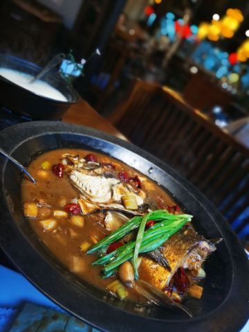 千岛湖有机鱼头,秘制臭鱼尾,徽州毛豆腐,红烧臭桂鱼,古城红烧鱼头,秀水鱼鳔,千岛湖鱼头汤,鸡汁脆笋,葱烧鱼头泡饼,香酥梅干菜饼,清炒鸡毛菜,鱼头泡饼,腌笃鲜,小甜豆浓汤煲笋尖,八宝鱼头汤(中份),家常烙饼,凉拌素鸡丝,米饭