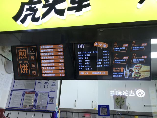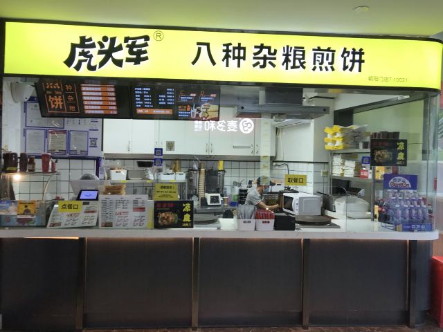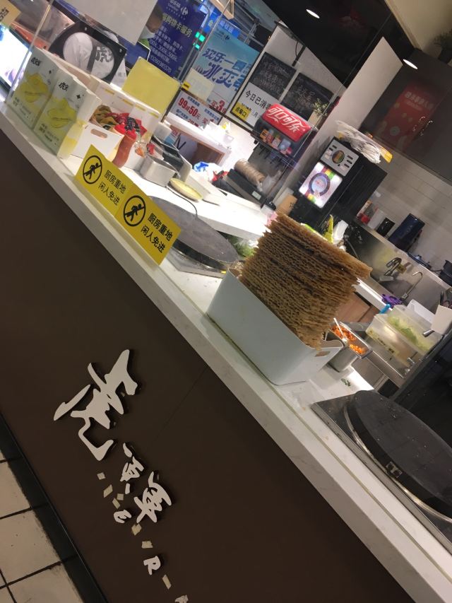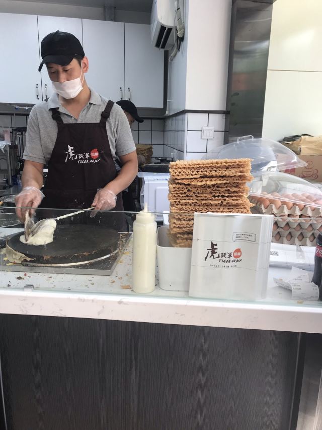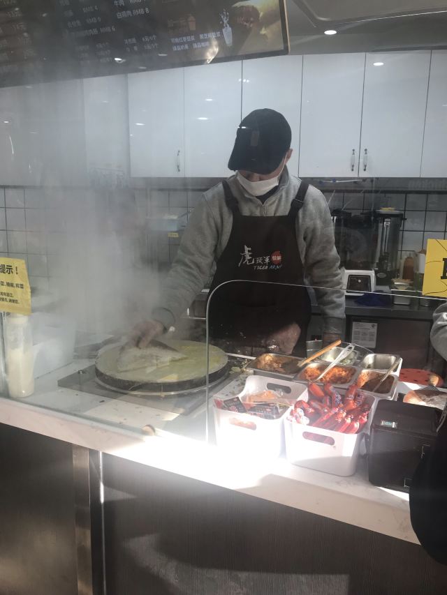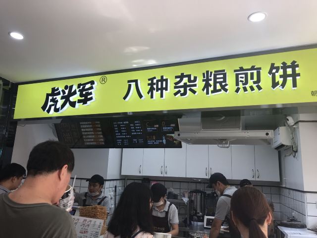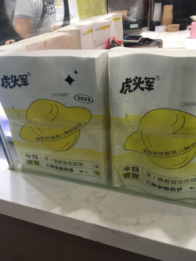 扫完健康宝进到店里来,一抬眼就是虎头军的摊位,除了排队等现场制作的人很多以外,还有一个特别抓人心的就是煎饼的包装是有品牌标志的。